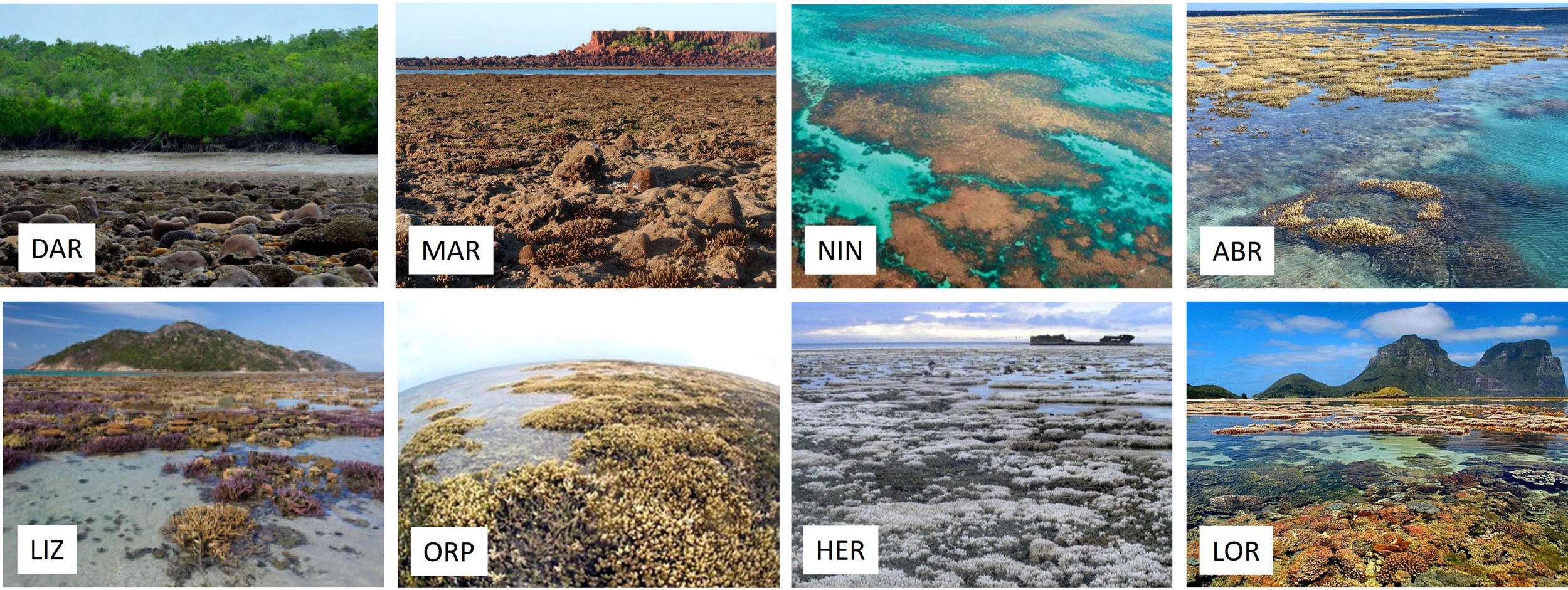 Photos depicting recorded emersion events for each study site. Photographs reproduced with permission from the following individuals and organizations: DAR (photo credit Craig Blount, ©INPEX), MAR (photo credit Zoe Richards), NIN (from Armstrong et al., 2007, © Department of Biodiversity Conservation and Attractions), ABR (photo credit Jo Buckee), LIZ (photo credit Michael Bok), ORP (© Centre for Excellence in Coral Reef Studies), HER (photo credit Andrew Thurber), LOR (Image Courtesy Black Diamond Images).