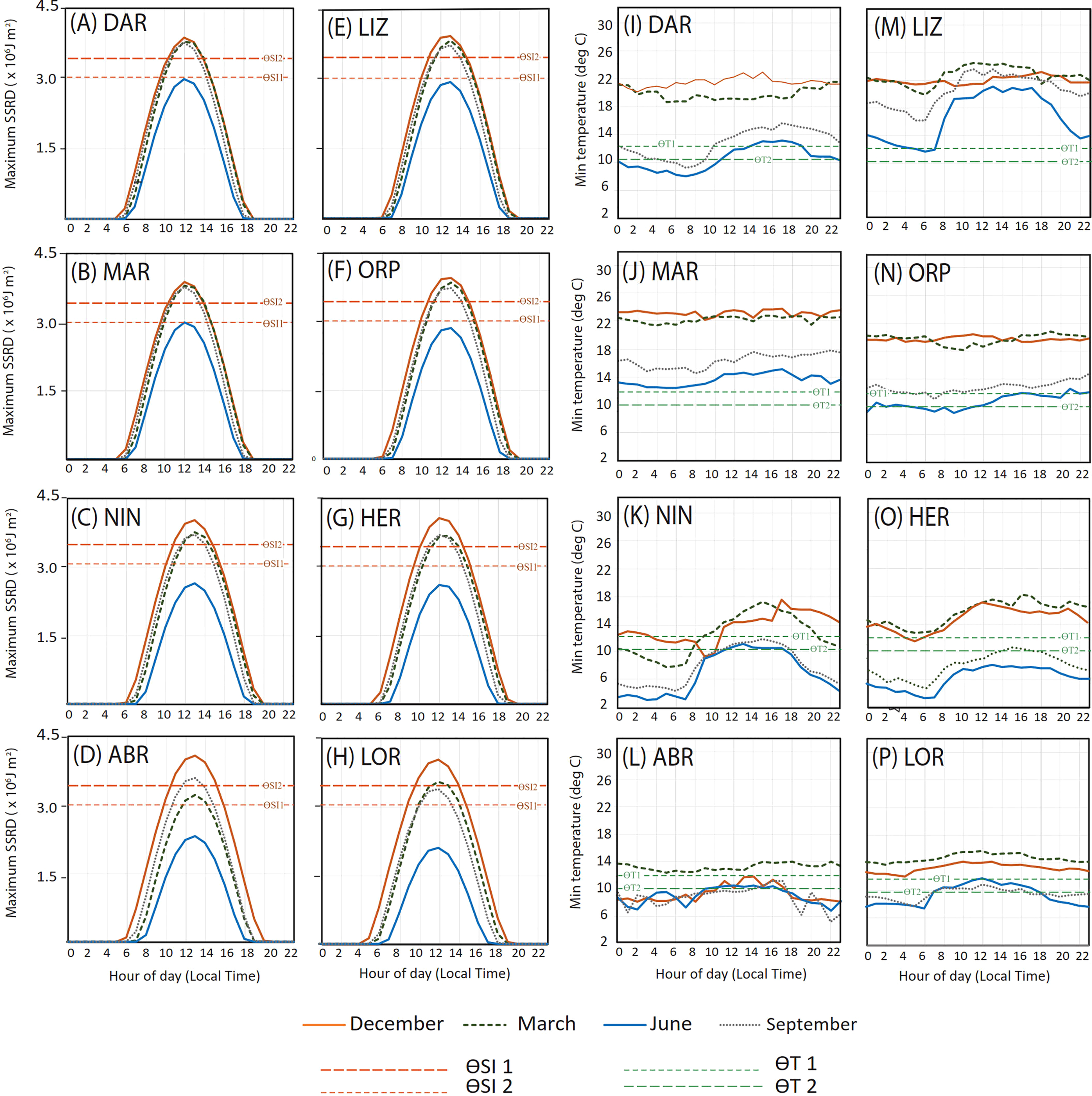 Diurnal variability in a) maximum solar irradiance (SSRD) and minimum atmospheric temperature (°C) for sites (A, I) Darwin (DAR), (B, J) Maret Island (MAR), (C, K) Ningaloo Reef (NIN), (D, L) Abrolhos Islands (ABR), (E, M) Lizard Island (LIZ), (F, N) Orpheus Island (ORP), (G, O) Heron Island (HER) and (H, P) Lord Howe Island (LOR). from hourly data for each calendar day over the years 1992 - 2016 for selected months illustrating seasonal extremes. Threshold values for solar irradiance (ƟSI 1 and ƟSI 2), and atmospheric temperature (ƟTw 1 and ƟTw 2) indicated by dashed lines.