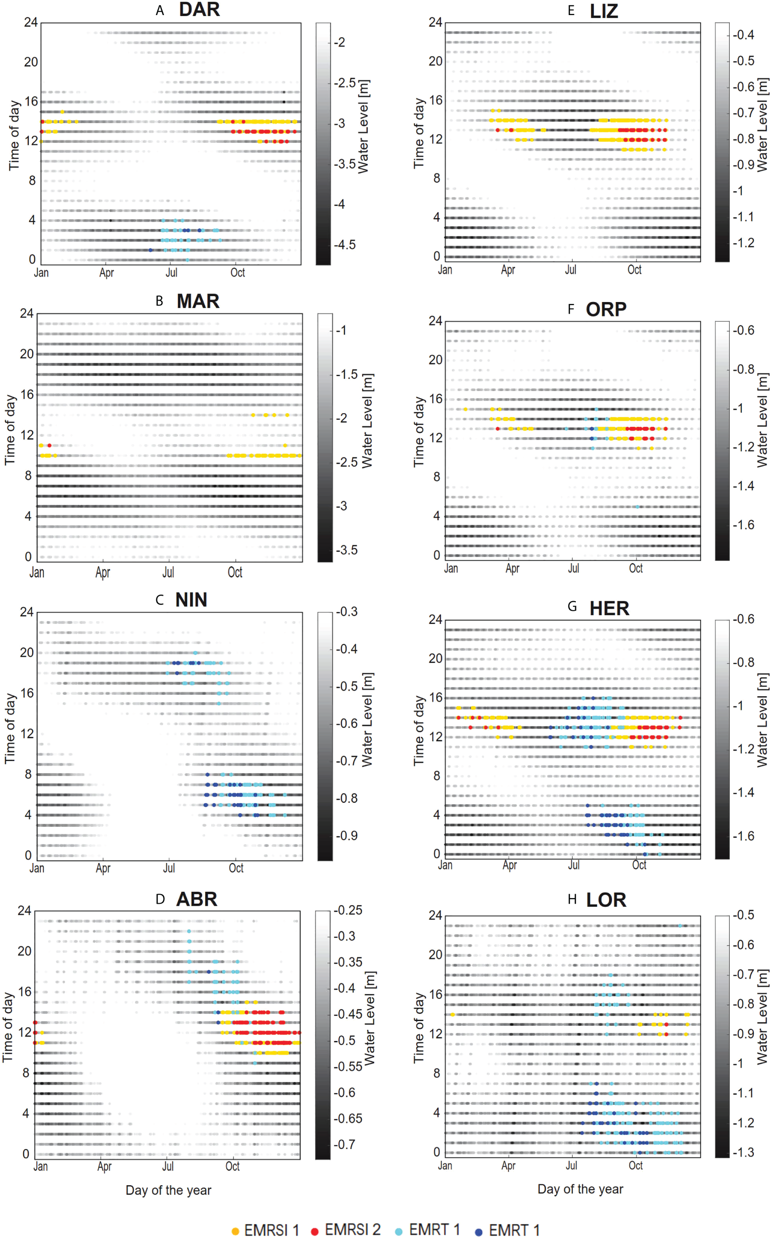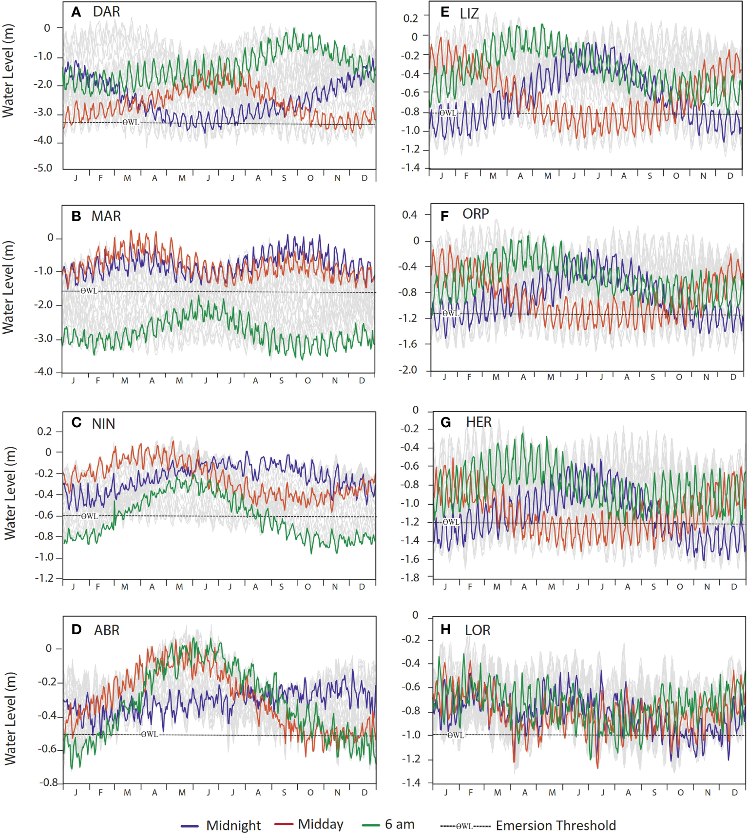 All the sites displayed a distinct annual cycle in the daily timing of low tide, as illustrated by daily WL minima (1992 – 2016) relative to the emersion threshold for selected hours (Figures 5A–H). Minimum WLs at midday (when SI is greatest), at midnight (for contrast) and at 6 am (indicating coldest atmospheric temperatures) highlight the seasonality in minimum WLs for each hour of the day. For further illustration of the seasonal pattern in hourly water by site, see ESM 4 which provides graphs of the average hourly water level per site for each hour and day of the year (1992 – 2016).