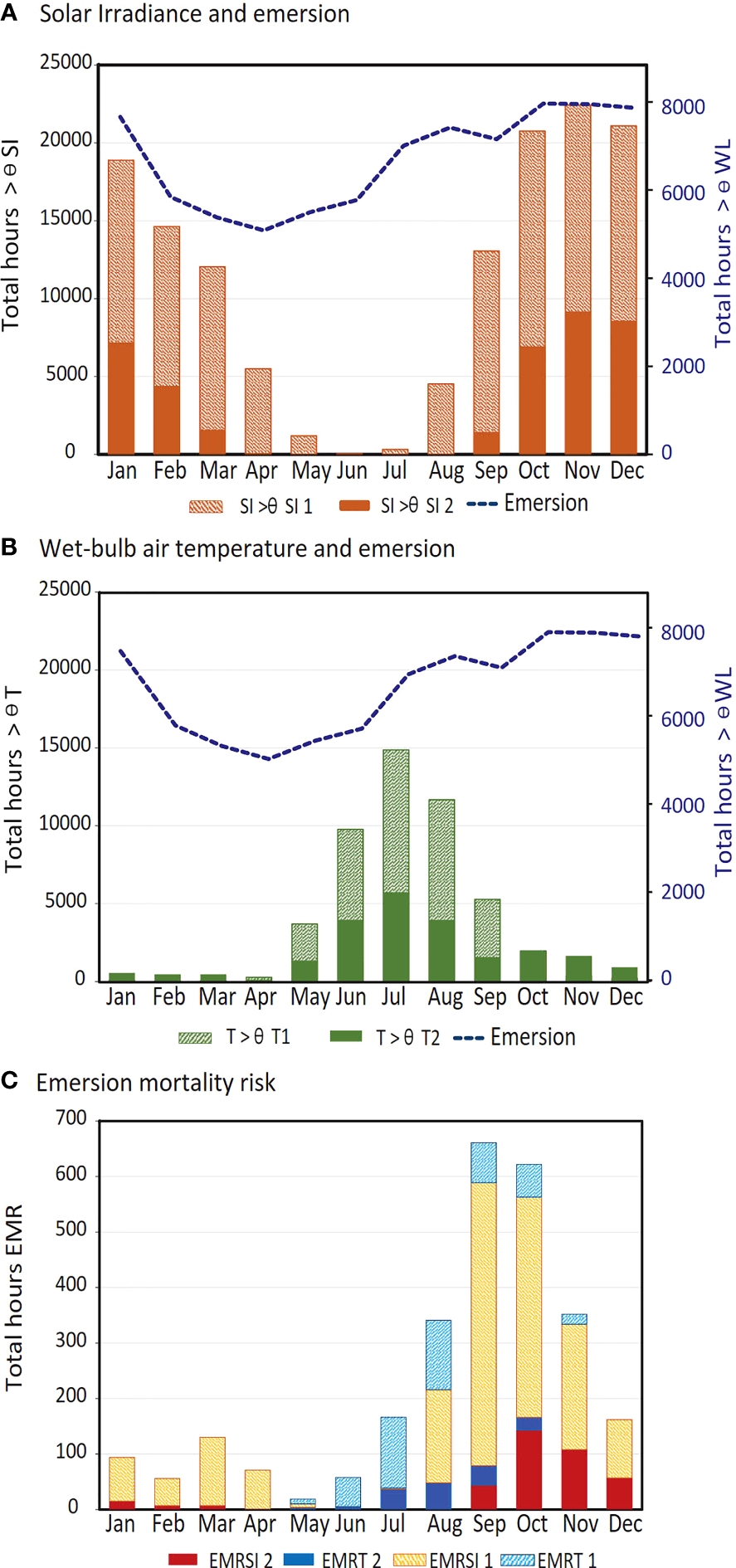 Coral EMR due to high solar irradiance (EMRSI) was inferred from the coincidence at an hourly scale of emersion (ƟWL) with high solar irradiance (SI), and coral EMR due to low atmospheric temperature (EMRT) was inferred from the coincidence at an hourly scale of emersion (ƟWL) with or low atmospheric temperature (Tw):