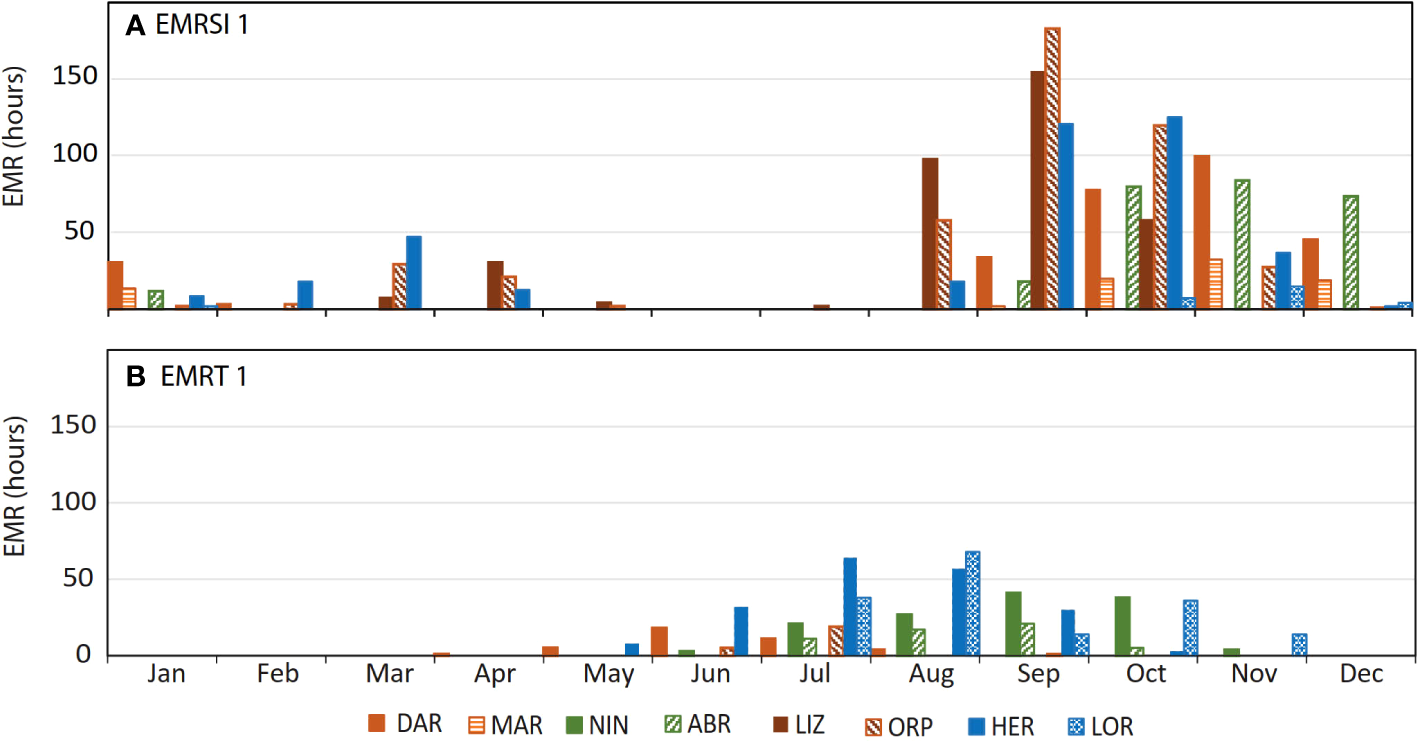 Minimum atmospheric temperature remained above the temperature threshold ƟTw1 (12°C) and ƟTw2 (10°C) all year at MAR (Figure 3B) and most of the year at LIZ (Figure 3E), but not at DAR (Figure 3A). At ORP temperatures dropped below ƟTw1 between April and August but was mostly above ƟTw2 all year. At the southern sites NIN, ABR, HER, and LOR (Figures 3C, D, G, H), all experienced periods of minimum temperature less than ƟTw1 and ƟTw2 from around April/May to October/November. Despite being further south, the offshore island sites ABR and LOR (Figures 3D, H) both showed less extreme minimum temperatures than NIN and HER (Figures 3C, G) which are located closer to the Australian mainland (Figure 1A). This is most likely due to the moderating effect of the ocean on the extreme temperatures.