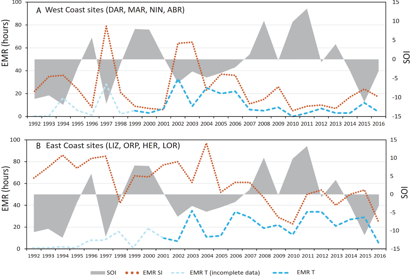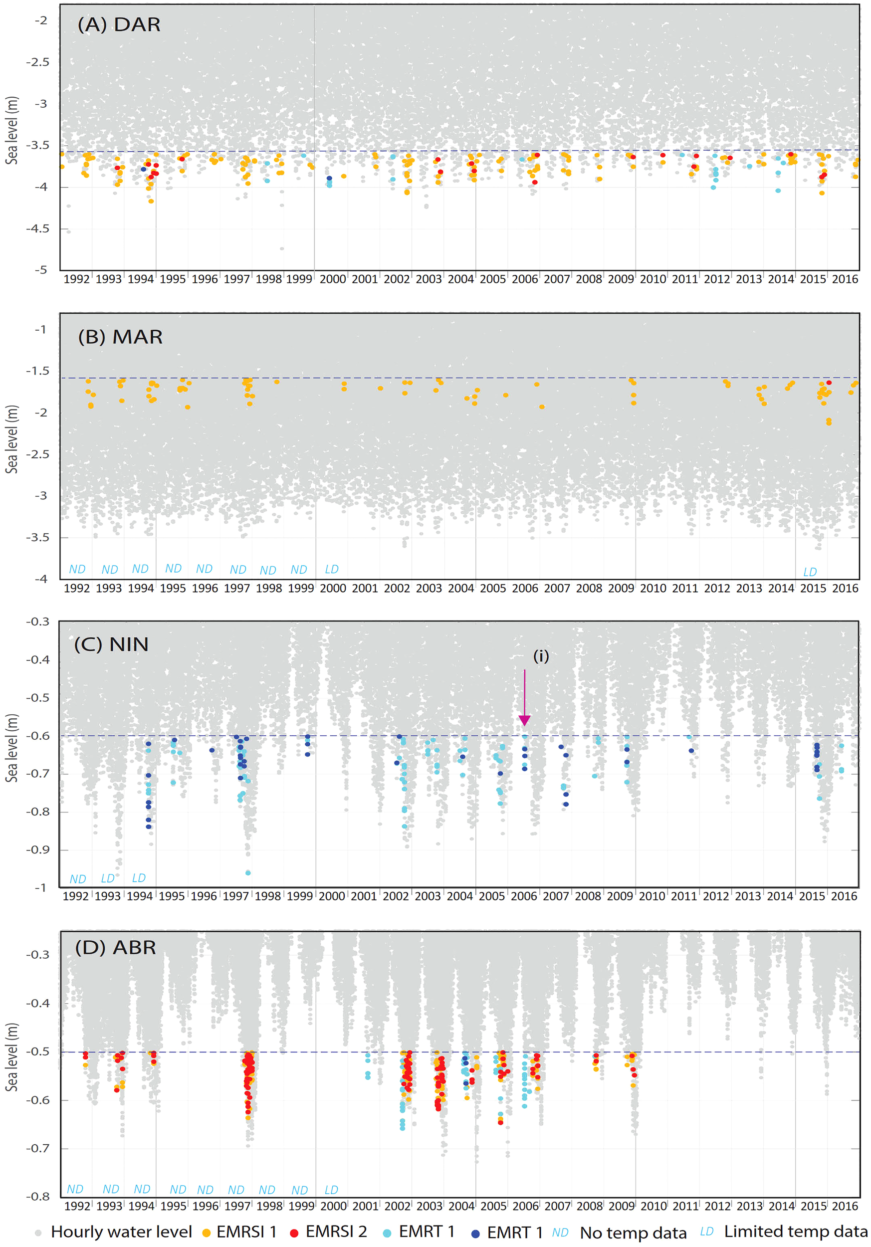 Seasonal variability in water levels and atmospheric stressors is a fundamental constraint to the preconditions for EMR; namely emersion (WL< ƟWL), high solar irradiance (SI > ƟSI) or low atmospheric temperatures (Tw< ƟTw). Emersion occurred in all months of the year at all sites, however seasonality was evident in minimum values and frequency of emersion (Figures 3A–H, Table 3, ESM 2A). As expected, solar irradiance exceeding thresholds generally occurred over the Austral summer, and lower atmospheric temperatures occurred mainly during winter, however there were differences between the sites as discussed below. It is worth noting that whilst WL and SI data were mostly complete for 1992 – 2016, temperature data were not available for all years and sites (Table 2, ESM 1).