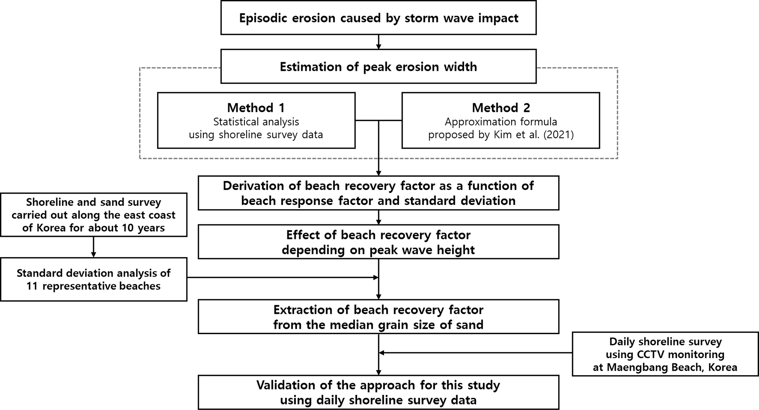 Recently, Kim et al. (2021) expressed the peak erosion width due to storm waves as a function of beach response and recovery factors by applying shoreline survey data and ODE model results. In addition, Kim et al. (2021) and Lim et al. (2021) verified that the shoreline survey data collected for many years follows a Gaussian distribution. Moreover, a method for statistically estimating the peak erosion width due to storm waves is proposed. In this study, a methodology to extract the beach recovery factor will be proposed by comparing two ways in which. Also, this paper studies how the beach recovery factor changes according to the wave and sand characteristics. The variability of the shoreline was analyzed from shoreline survey data obtained from the east coast of Korea for about 10 years, and this result was applied to reveal that the beach recovery factor can also be a function of the median grain size. Lastly, the applicability of this approach was verified by using CCTV monitoring data obtained from Maengbang Beach in East Sea. Figure 1 shows how the research was conducted to extract the beach recovery factor. If conditions are not given to carry out this, the result may be limited to the east coast of Korea, but it can be a means to estimate from the median grain size value easily.