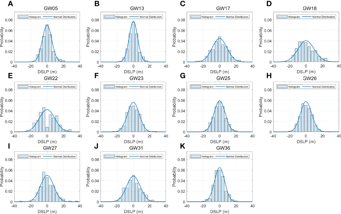 Figure 4 Probability distributions of shoreline data surveyed on 11 representative beaches of the east coast of Korea: (A) GW05 (B) GW13 (C) GW17 (D) GW18 (E) GW22 (F) GW23 (G) GW25 (H) GW26 (I) GW27 (J) GW31 (K) GW36.