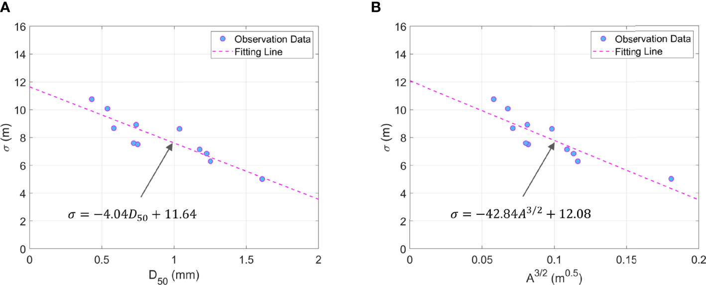 Figure 5 Correlation curve between grain size of sand and standard deviation: (A) median grain size D50; (B) beach scale factor A.