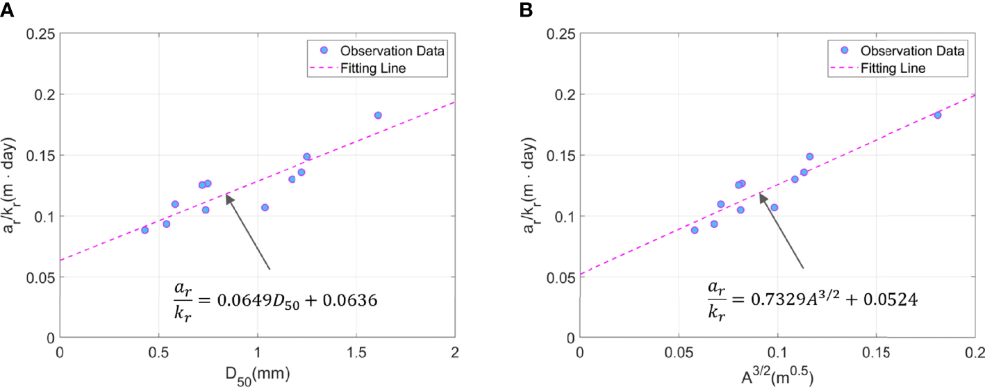 Figure 6 Correlation curve between grain size of sand and ar/kr: (A) median grain size D50; (B) beach scale factor A..