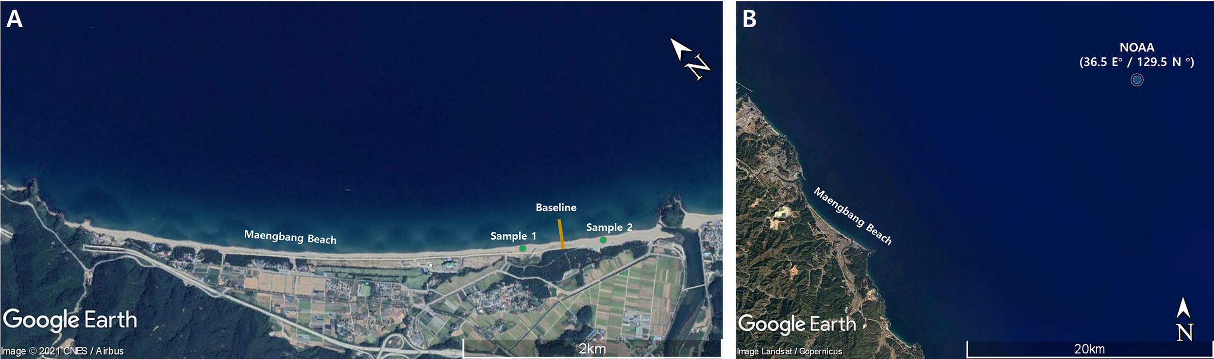 Figure 7 Location of Maengbang Beach: (A) sand and shoreline data (B) NOAA data (Google Earth Image).