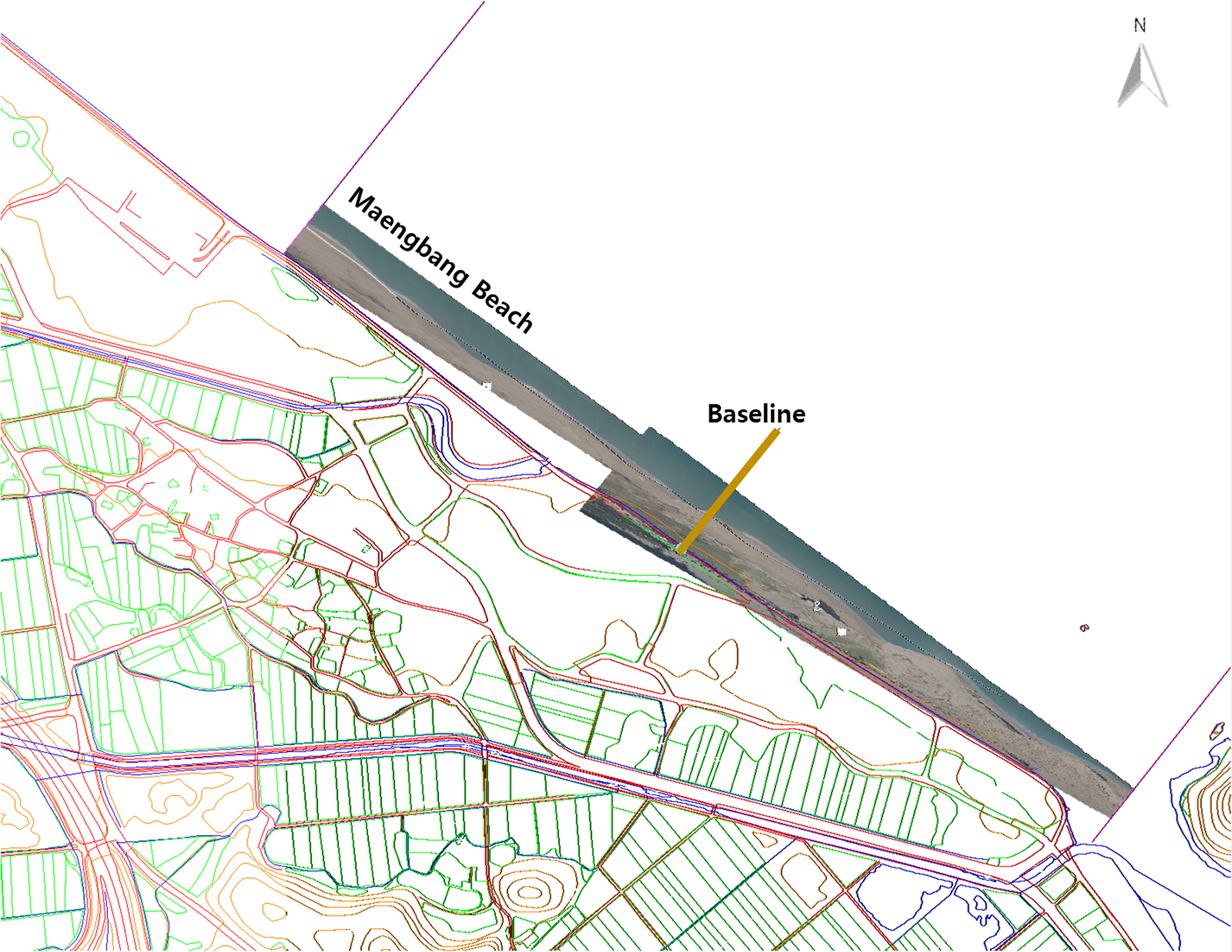 To verify the validity of the methodology proposed in this study, the shoreline evolution data of Maengbang Beach were extracted using CCTV. Shorelines were extracted from geo-rectified images following the method of Lippmann and Holman (1989). Figure 8 shows a geometrically corrected image of CCTV data on Maengbang Beach. To extract shoreline data from the CCTV, it is important to define the location of the shoreline. Thus, a great number of researches have been conducted to define it from the past (Lippmann and Holman, 1989; Plant and Holman, 1997; Boak and Turner (2005). For the paper, CCTV images were captured continuously for a certain period of time and then compounded. On the image, the swash zone is clearly seen in a white band shape, which makes it possible to extract the shoreline for the paper (Lippmann and Holman, 1989; Plant and Holman, 1997). In addition, if the data was taken on a day with high wave height, it was removed to minimize the effects of large swash excursion in extracting the shoreline from the image (Davidson and Turner, 2009).