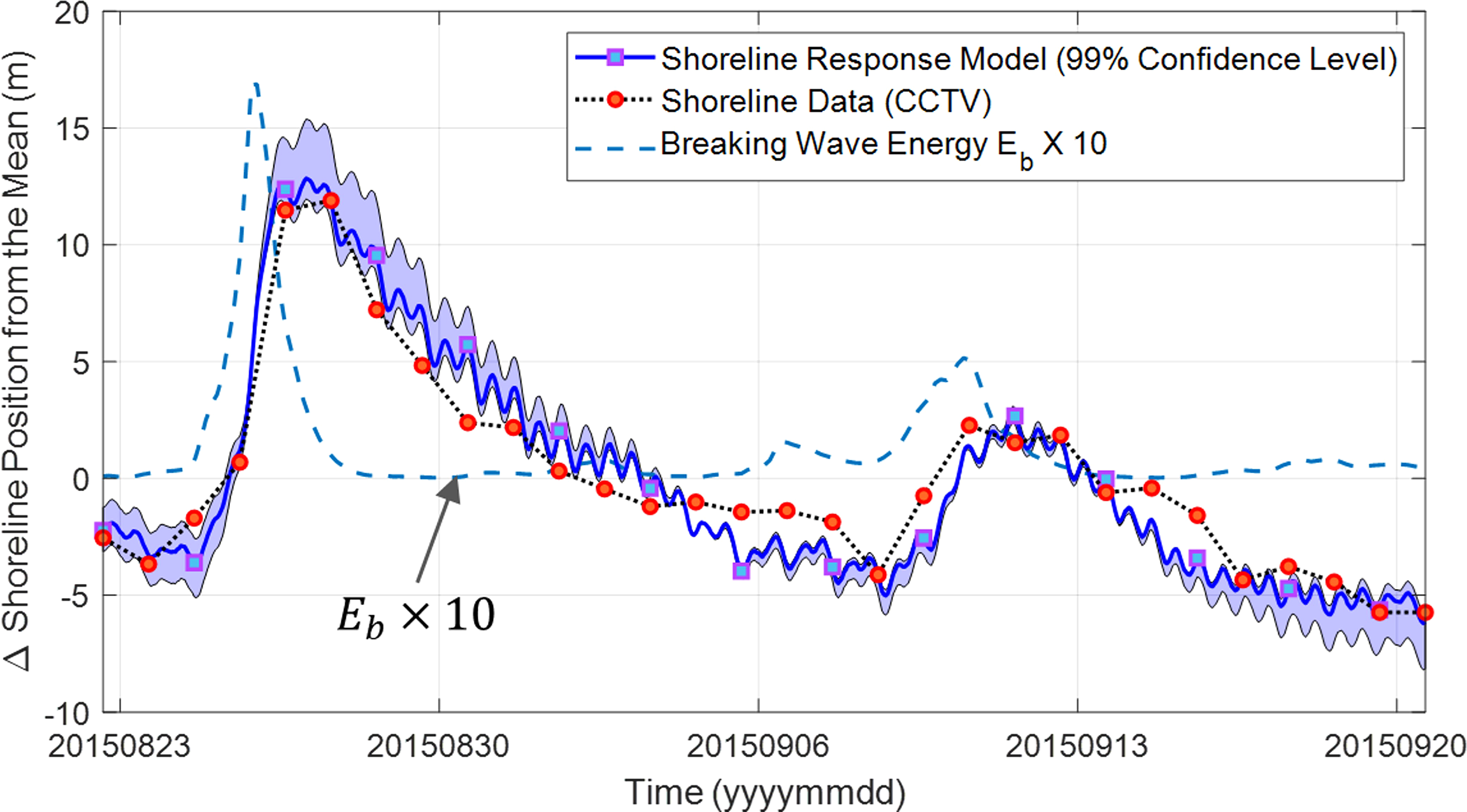 where y is the shoreline erosion width (positive value), kr is a coefficient related to the recovery rate of the eroded shoreline as the beach recovery factor, and ar is the beach response factor, which is a proportional constant between the wave energy at the breaking point and the equilibrium shoreline position as studied by Yates et al. (2009). And Eb is the wave energy at the breaking point defined by Yates et al. (2009) as