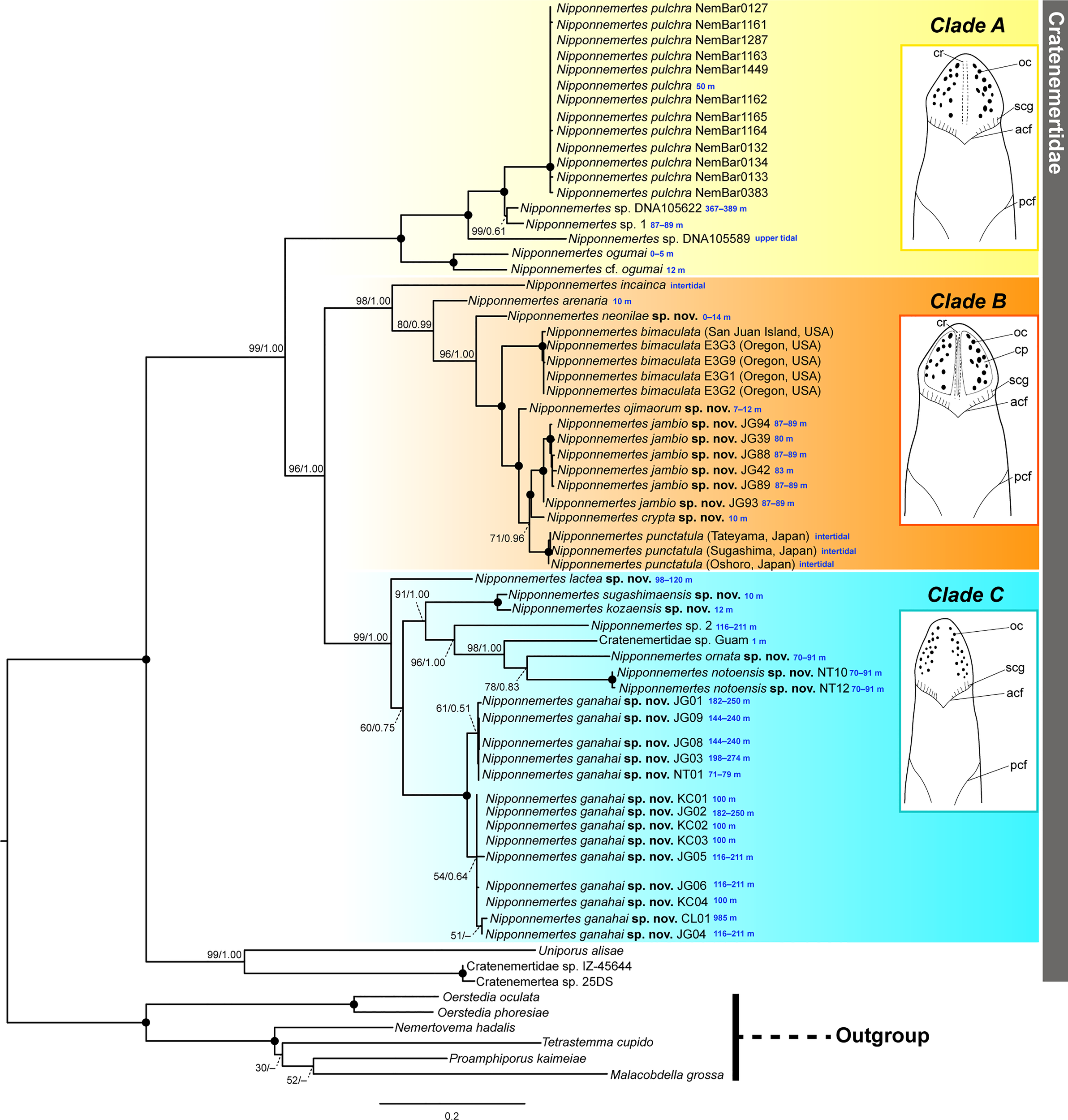 Species in the genus Nipponnemertes—18 are currently recognized as valid—represent the majority of Cratenemertea (Gonzalez-Cueto et al., 2017; Kajihara, 2021b). They are marine benthic, usually feeding on small crustaceans such as amphipods (Brunberg, 1964; Berg, 1972; McDermott, 1984; McDermott, 1993; McDermott, 1997) and caridean shrimps (Kajihara et al., 2015) by sucking out body fluid and internal tissue of those prey organisms. Nipponnemertes was established by Friedrich (1968) for the seven nominal species Amphiporus bergendaliGering, 1912, Amphiporus drepanophoroidesGriffin, 1898, Amphiporus pacificusCoe, 1905, Amphiporus occidentalisCoe, 1905, Amphiporus punctatulusCoe, 1905, Cratenemertes danaeFriedrich, 1957, and Cratenemertes madagascarensisKirsteuer, 1965 without type designation, and thus was unavailable under Article 13.3 of the International Code of Zoological Nomenclature (International Commission on Zoological Nomenclature, 1999). To make Nipponnemertes nomenclaturally available, Gibson & Crandall (1989) designated A. drepanophoroides as the type species and provided a morphological diagnosis for the genus; the authorship of Nipponnemertes is thus ascribed to Gibson & Crandall (1989). Phylogenetic relationships among some members of Nipponnemertes were inferred by Kajihara et al. (2015), where four described—Nipponnemertes bimaculata (Coe, 1901), Nipponnemertes ogumai (Yamaoka, 1947), Nipponnemertes pulchra (Johnston, 1837), and Nipponnemertes punctatula (Coe, 1905)—and two undescribed congeners—Nipponnemertes sp. 1 (MCZ DNA105622) and Nipponnemertes sp. 2 (MCZ DNA105589) (Andrade et al., 2012)—were analysed. The resulting tree indicated that the six species were divided into two groups, which seemed to be characterized by the presence and absence of a cephalic patch (Kajihara et al., 2015); however, it has never been confirmed based on a more comprehensive dataset.