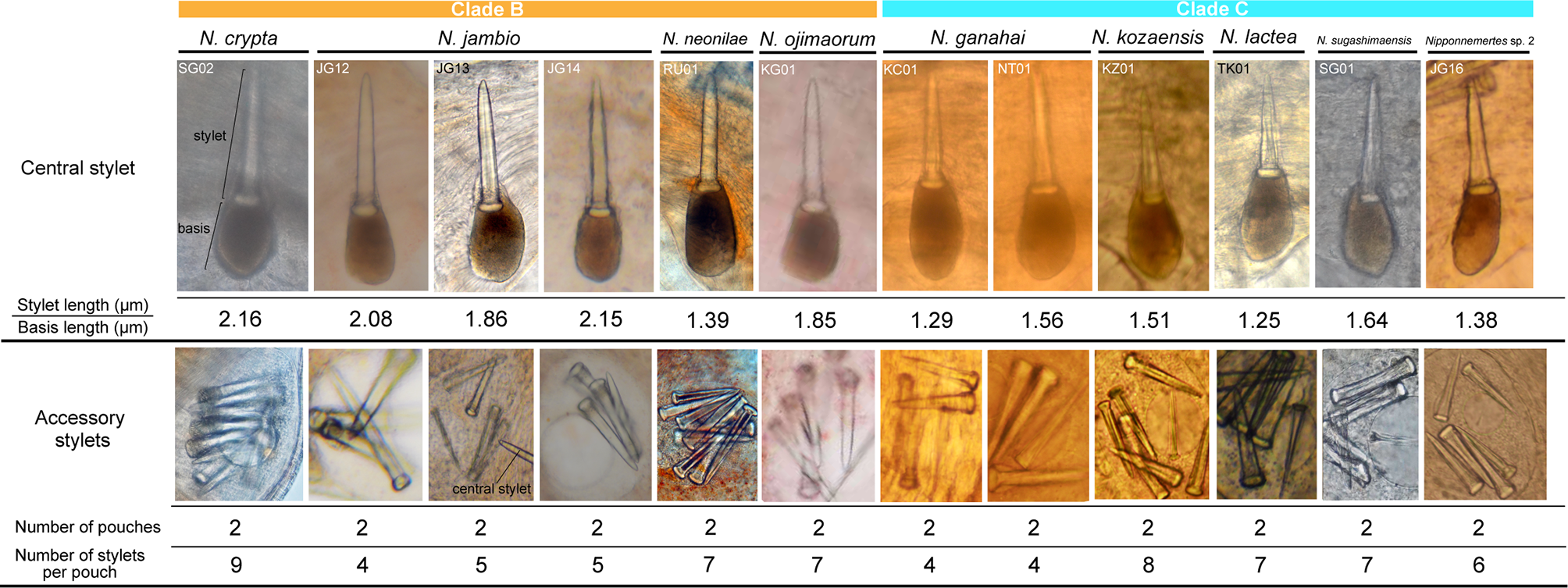 With the advent of molecular tools—DNA barcoding and molecular phylogeny—in monostiliferan systematics (e.g., Andrade et al., 2012; Kvist et al., 2014; Kvist et al., 2015; Leasi et al., 2016; Hookabe et al., 2020; Hookabe et al., 2021), we are now in a position to obtain a more accurate picture of the species diversity. Some of the diagnostic characters traditionally used in monostiliferan taxonomy are often ambiguous and thus need to be revisited with molecular phylogeny. In the present study, we describe 10 new species of the genus from Japanese and Far East Russian waters. Since previous studies on molecular phylogenetic study in Nipponnemertes were biased toward shallow-water species (e.g., Kajihara et al., 2015) despite the bathymetrically wide distribution of this taxon, we extensively sampled specimens from intertidal to bathyal waters by various methods: by hand for intertidal species, SCUBA, dredging, sledging, and a remotely operated vehicle (ROV) equipped with a slurp gun. In the description part, histological observation (including cerebral organ, which is an important character for distinguishing Nipponnemertes from Cratenemertes) was performed to characterize the internal morphology of each taxon. Using molecular data obtained from the newly discovered species and described species from Japanese and Far East Russian waters, phylogenetic analyses based on partial sequences of nuclear and mitochondrial genes are performed to assess phylogenetic relationships as well as species boundaries within the genus.