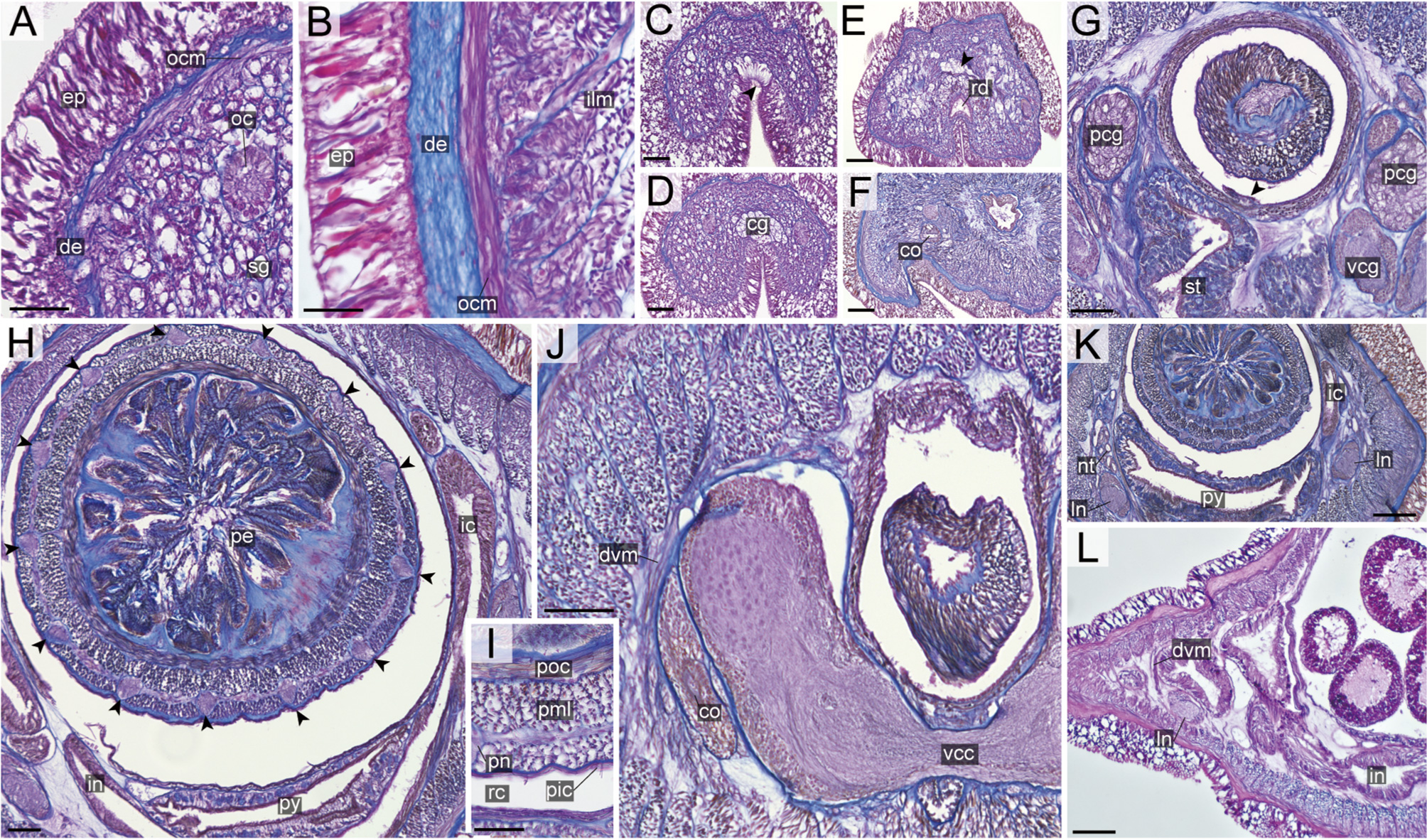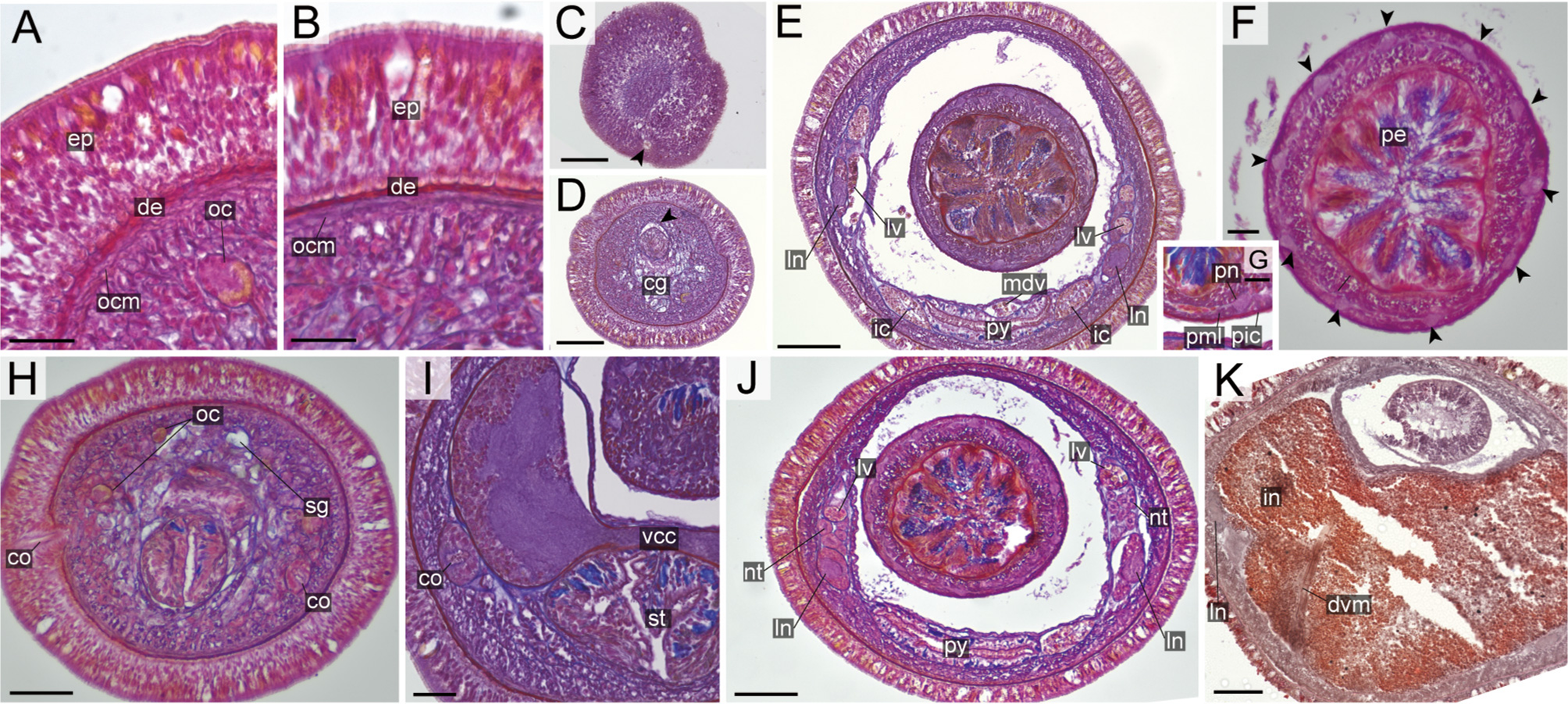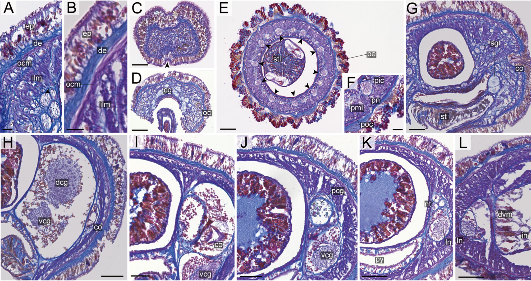 In the present study, we collected cratenemertids from Japanese and Far East Russian waters in 2014–2021 by multiple methods (Figure 1 and Table 1). Specimens were photographed with digital still cameras NIKON D5600 (NIKON, Japan) or OM-D E-M1 Mark II (Olympus, Japan) while they were alive. Worms were anaesthetized in 7.5% MgCl2 and gently placed between a slide glass and cover slip with a drop of anaesthetic solution so that ocelli and stylet apparatus could be observed under a light microscope. Afterwards, worms were picked up from the slides and the posterior tips were preserved in 99% ethanol for DNA extraction while the rest of the body was pre-fixed in 10% formalin in seawater, then post-fixed in Bouin’s fluid for 24 hours, and transferred to 70% ethanol. For histological preparation, samples preserved in 70% ethanol were dehydrated in a series of ethanol solutions (70%, 80%, 90%, 95%, and 99% ethanol), cleared in xylene, and embedded in Surgipath Paraplast paraffin (Leica, Germany). Paraffin blocks were serially sectioned at 7 µm thickness and stained with Mallory’s trichrome method (Gibson, 1994).