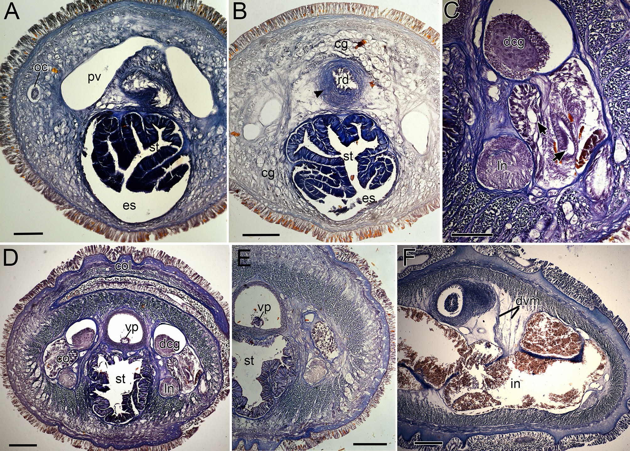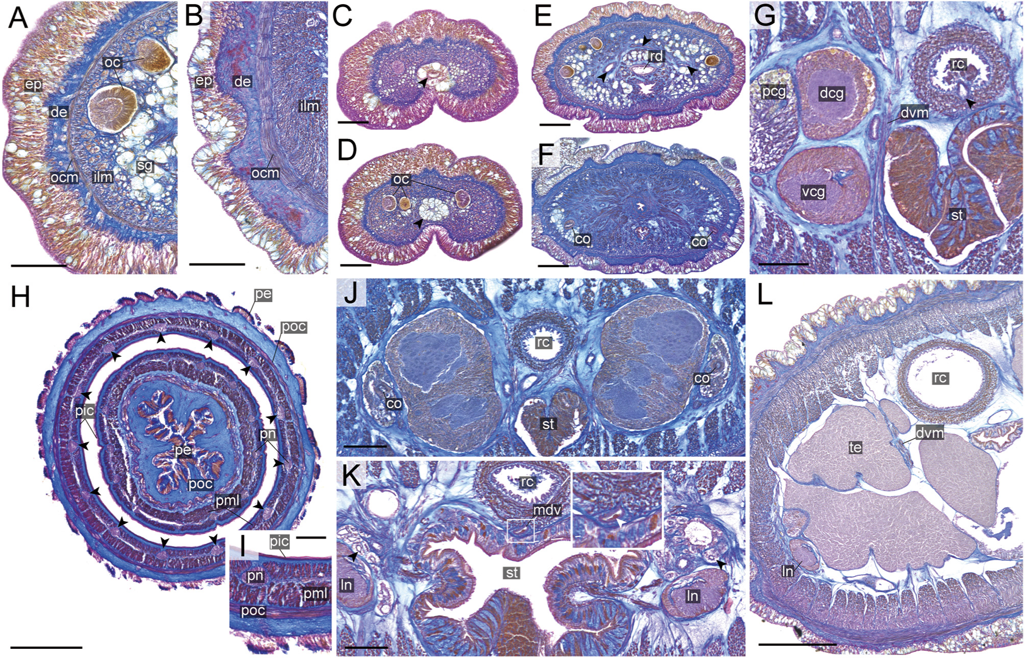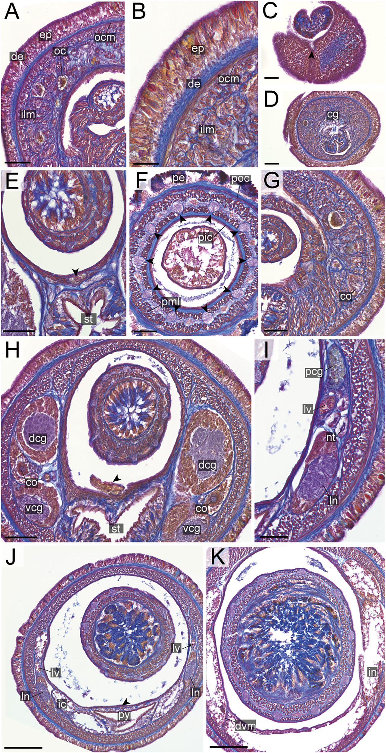 In the present study, we collected cratenemertids from Japanese and Far East Russian waters in 2014–2021 by multiple methods (Figure 1 and Table 1). Specimens were photographed with digital still cameras NIKON D5600 (NIKON, Japan) or OM-D E-M1 Mark II (Olympus, Japan) while they were alive. Worms were anaesthetized in 7.5% MgCl2 and gently placed between a slide glass and cover slip with a drop of anaesthetic solution so that ocelli and stylet apparatus could be observed under a light microscope. Afterwards, worms were picked up from the slides and the posterior tips were preserved in 99% ethanol for DNA extraction while the rest of the body was pre-fixed in 10% formalin in seawater, then post-fixed in Bouin’s fluid for 24 hours, and transferred to 70% ethanol. For histological preparation, samples preserved in 70% ethanol were dehydrated in a series of ethanol solutions (70%, 80%, 90%, 95%, and 99% ethanol), cleared in xylene, and embedded in Surgipath Paraplast paraffin (Leica, Germany). Paraffin blocks were serially sectioned at 7 µm thickness and stained with Mallory’s trichrome method (Gibson, 1994).