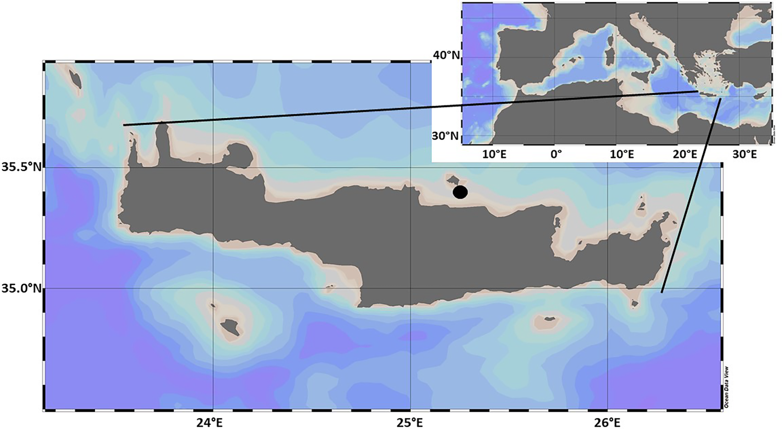 Study area showing the position of Crete in the Mediterranean Sea, and the sampling location (Filled black circle) where seawater was collected for the purpose of the SiNAME experiment (Bay of Gournes). Map created using Ocean Data View.