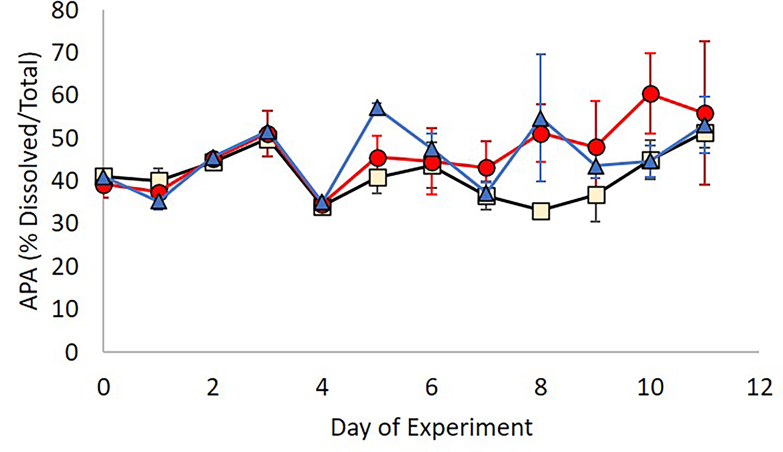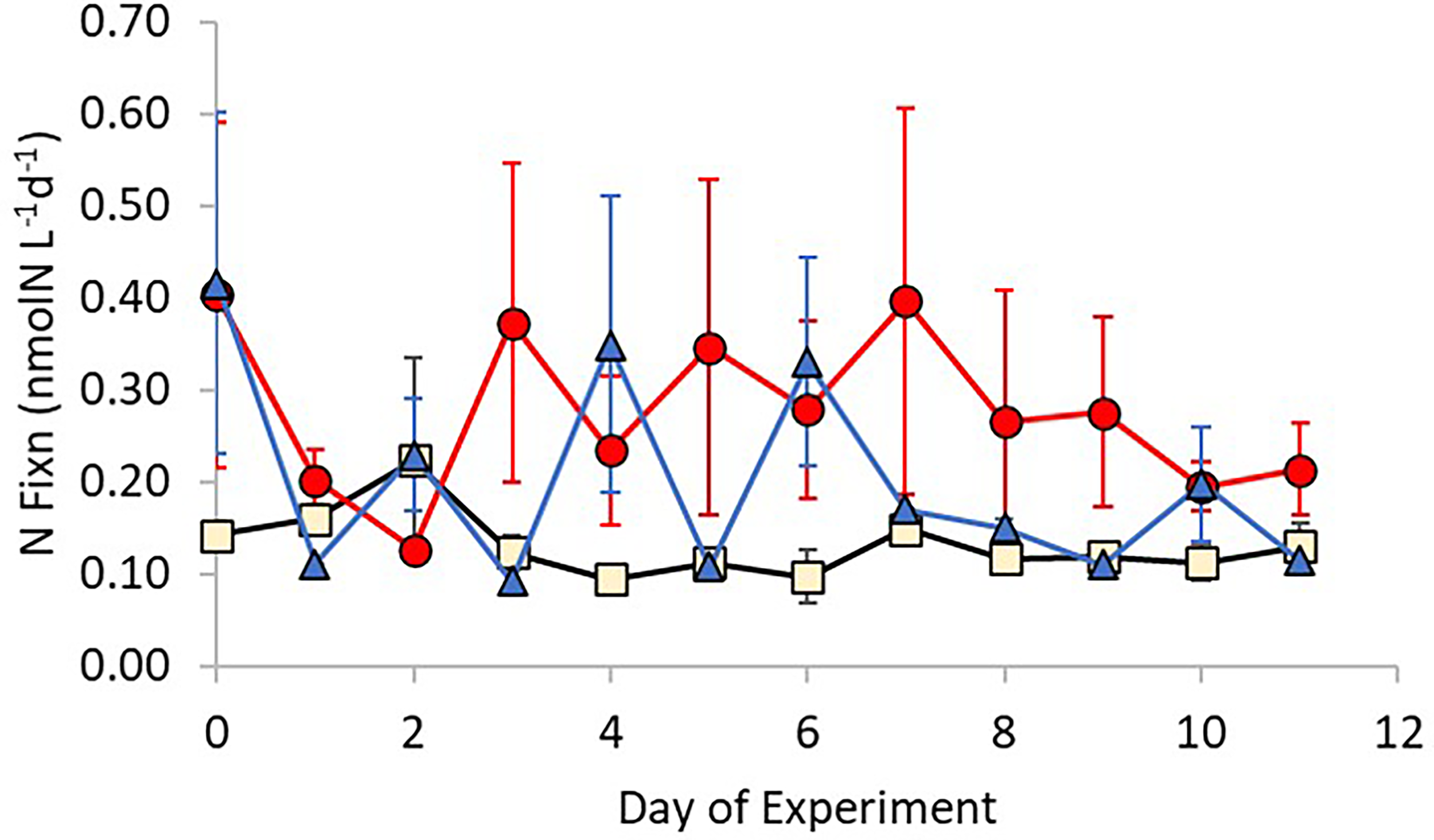 Changes in nitrogen fixation rates over time for each treatment (Control – Beige; +Ag+ – blue; +AgNP – red). Error bars show ± 1 standard deviation of the mean.