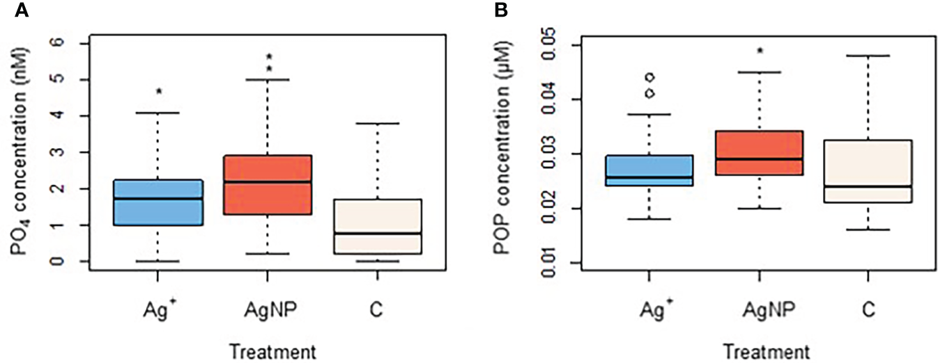 Changes in phosphate (A) and particulate organic phosphorus (B) as an effect of Ag+ and AgNPs addition. Asterisks above boxplots indicate levels of significance (p<0.05).