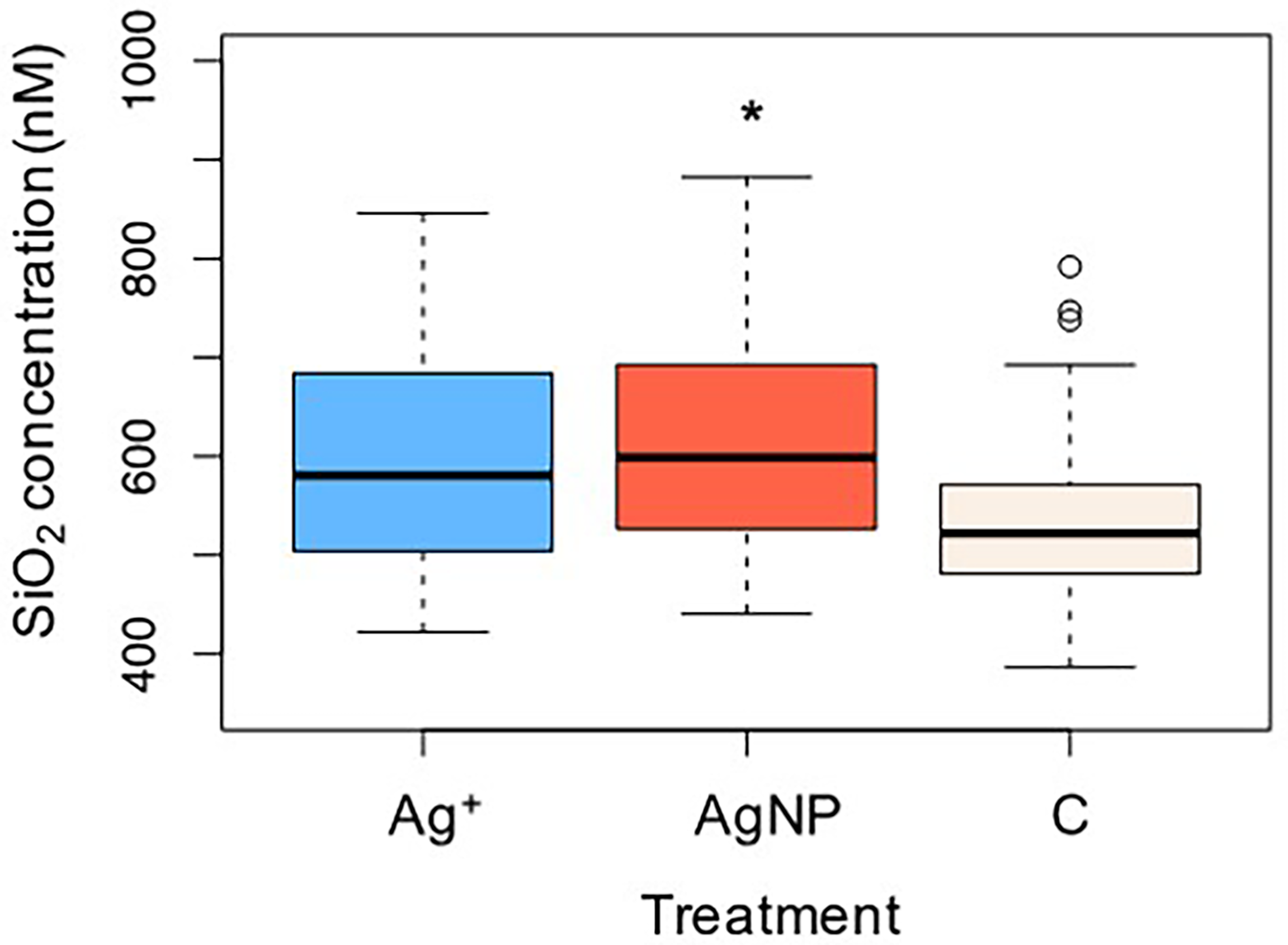 Changes in silicate as an effect of Ag+ and AgNPs addition. Asterisks above boxplots indicate levels of significance (p<0.05).