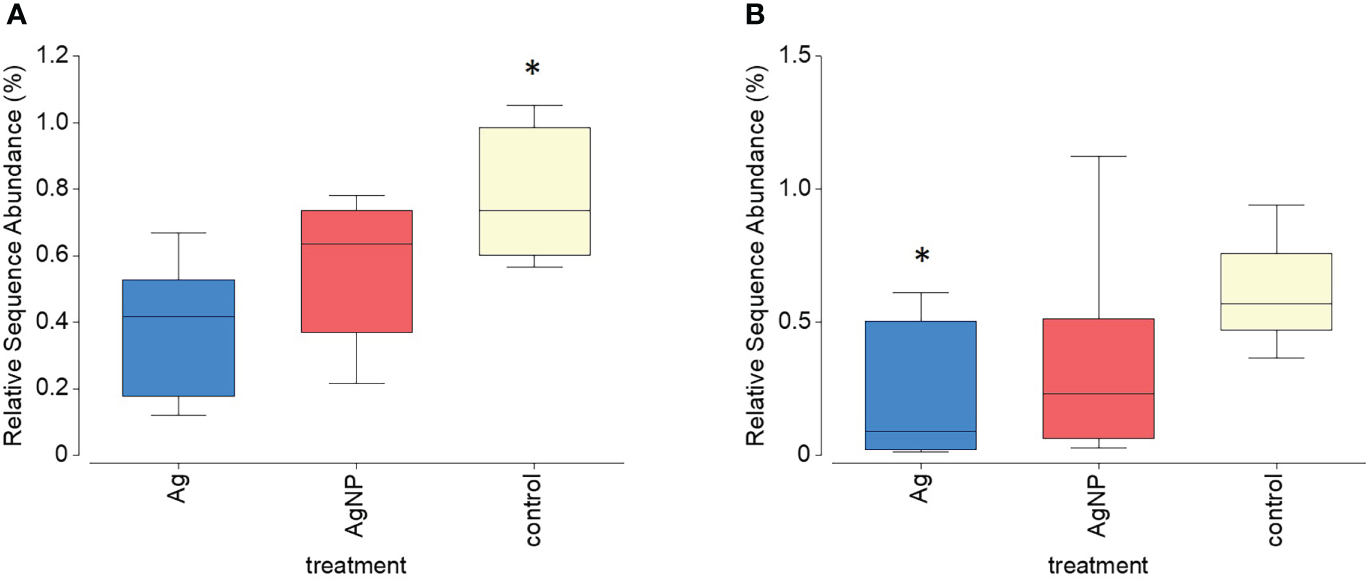 Relative sequence abundance of two ASVs (A)Gammaproteobacteria Ectothiorhodospiraceae and (B)Verrucomicrobia Opitutales) that significantly declined within treatments containing Ag+ and AgNP. Asterisks above boxplots indicate levels of significance (p<0.05).