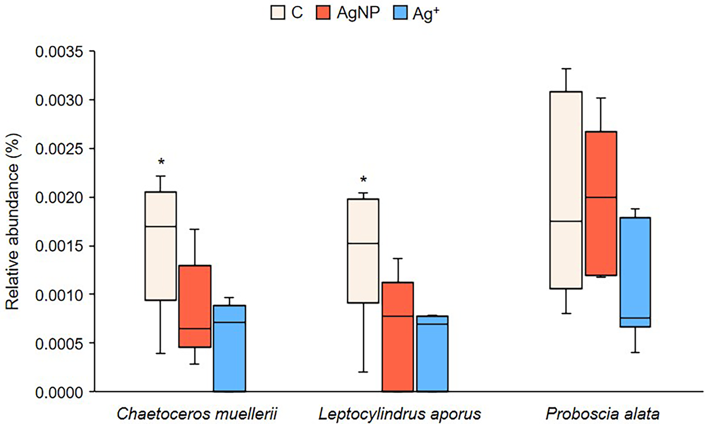 Similar to the prokaryote 16S rRNA gene data, ANOSIM tests show major changes to the eukaryote community (derived from 18S rRNA gene sequence data) over time (R = 0.737; p = 0.001) but there was no evidence of differences between treatments (R = 0.119; p = 0.236). At the start of the experiment, the community was dominated by Dinophyceae, Bacillariophyceae and Prymnesiophycaea sequences (Supplementary Figure 4). Over time, there was an increase in the relative abundance of sequences identified as grazers: first ciliates (Class Spirotrichea and Oligotichea), followed by Radiozoa Ancantharia and Hexanauplia. The Ag treatments had no significant effect on the abundance of eukaryote taxa. Detailed searches for taxa with higher or lower relative sequence abundance within the Ag+ and AgNP treated mesocosms showed three species of diatoms belonging to the Class Bacillariophyceae (Chaetoceros muelleri, Leptocylindrus aporus, Proboscia alata) which showed changes in relative abundance as an effect of treatments (Figure 10). Control groups exhibited a significantly higher abundance than Ag+ and AgNP treated mesocosms for the species Chaetoceros muelleri (PERMANOVA Pseudo-F = 6.682; p = 0.015), Leptocylindrus aporus (PERMANOVA Pseudo-F = 6.875; p = 0.017) and Proboscia alata (PERMANOVA Pseudo-F = 11.245; p = 0.003). Analyses conducted on other planktonic species and on different taxonomic levels (e.g. orders, classes) showed no significant changes in relative abundance between treatments.