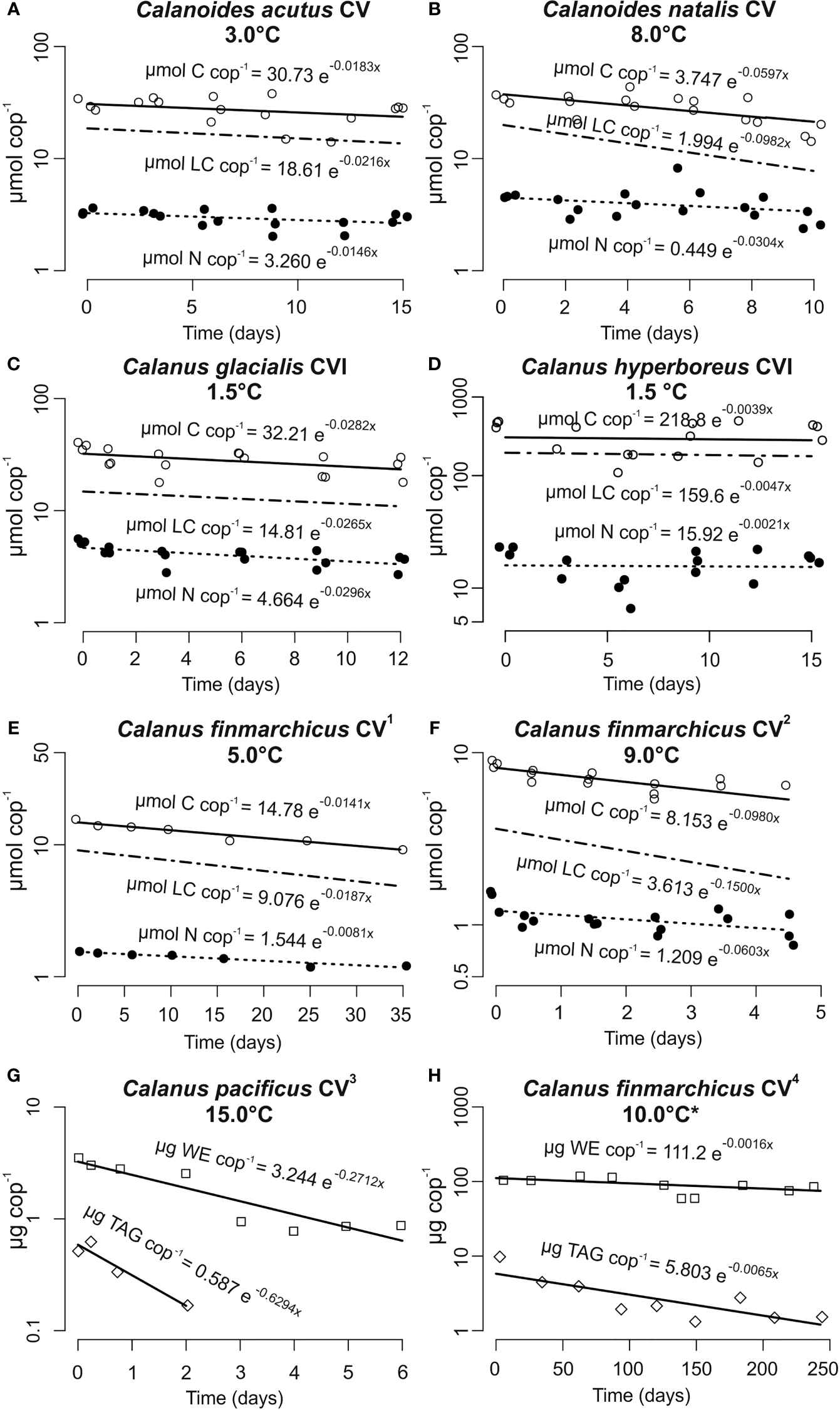 Biomass turnover rates of lipid-storing marine calanoid copepods during food deprivation. Note different scales on the x- and y-axes. Equation exponents provide the instantaneous turnover rate (d-1) for carbon (C) (open circles); nitrogen (N) (filled circles); lipid carbon (LC, no symbols as data were derived from C and N); wax esters (WE, open squares) and triacylglycerols (TAG, open diamonds). Data extracted from 1Mayzaud (1976); 2Mayor et al. (2011); 3Hakanson (1984); 4Clark et al. (2012). The total lipid pool in Clark et al. (2012) turned over at -0.0021 d-1 (data not shown); *typical deep-water temperature in Loch Etive (Edwards and Edelsten, 1977).