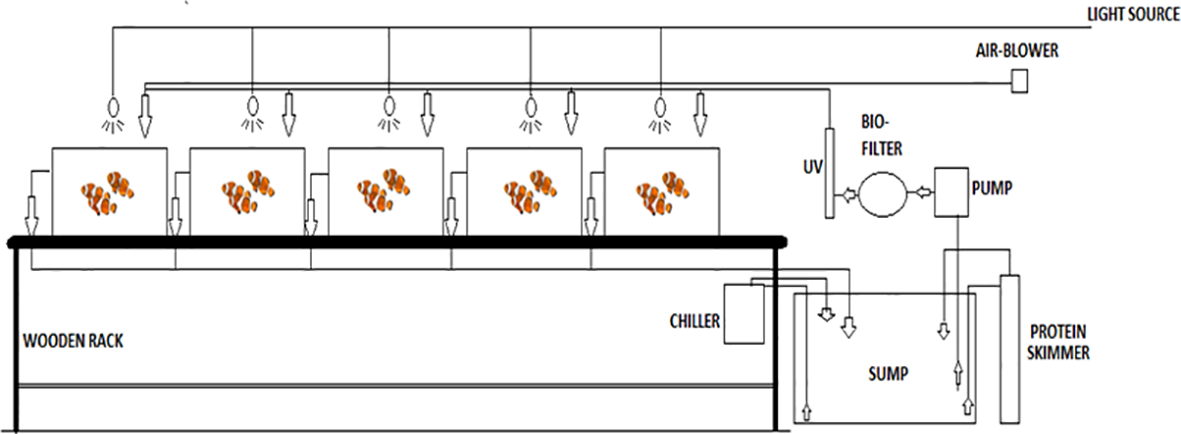 Schematic diagram of recirculating aquaculture system (RAS) for broodstock maintenance of designer clown fish.