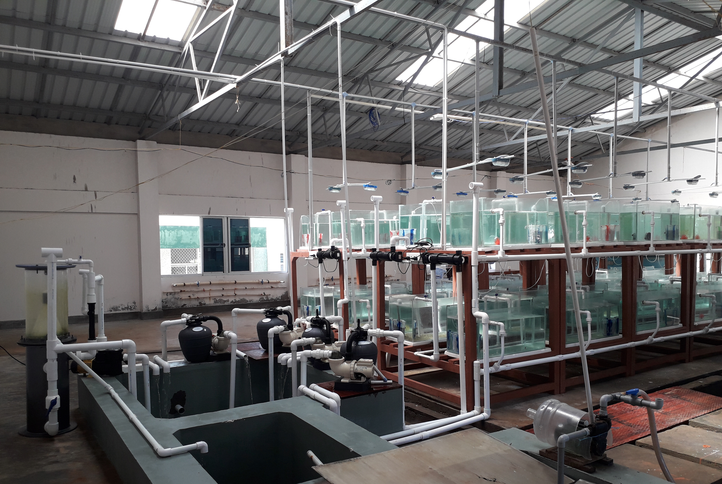 The broodstock of the fishes has to be maintained at optimum water quality conditions free from pathogenic organisms in order to condition them for breeding. The natural reef conditions were simulated to make the fishes feel at home, which has been found to trigger their hormonal pathways for induction of spawning and egglaying. Hence, compatible pairs were selected from the adult fishes and were then introduced into glass tanks of 150-L capacity in such a way that only one pair was maintained in one tank. All the glass tanks were connected to a recirculating aquaculture system (RAS) as shown in Figures 2, 3. Lighting was provided by installing compact fluorescent lamp (CFL) bulbs of suitable wattage above each tank, which could be controlled by a timer to maintain the optimum photoperiod. Adequate aeration was maintained in the tanks with the help of a blower of sufficient capacity and aeration lines.