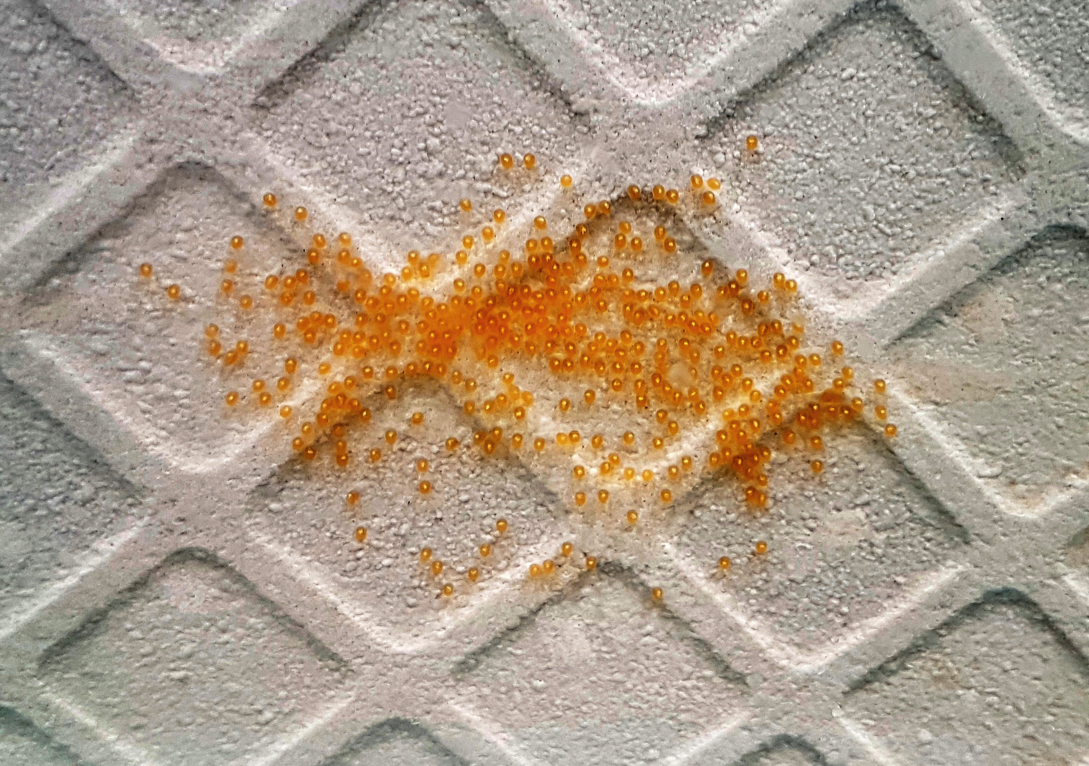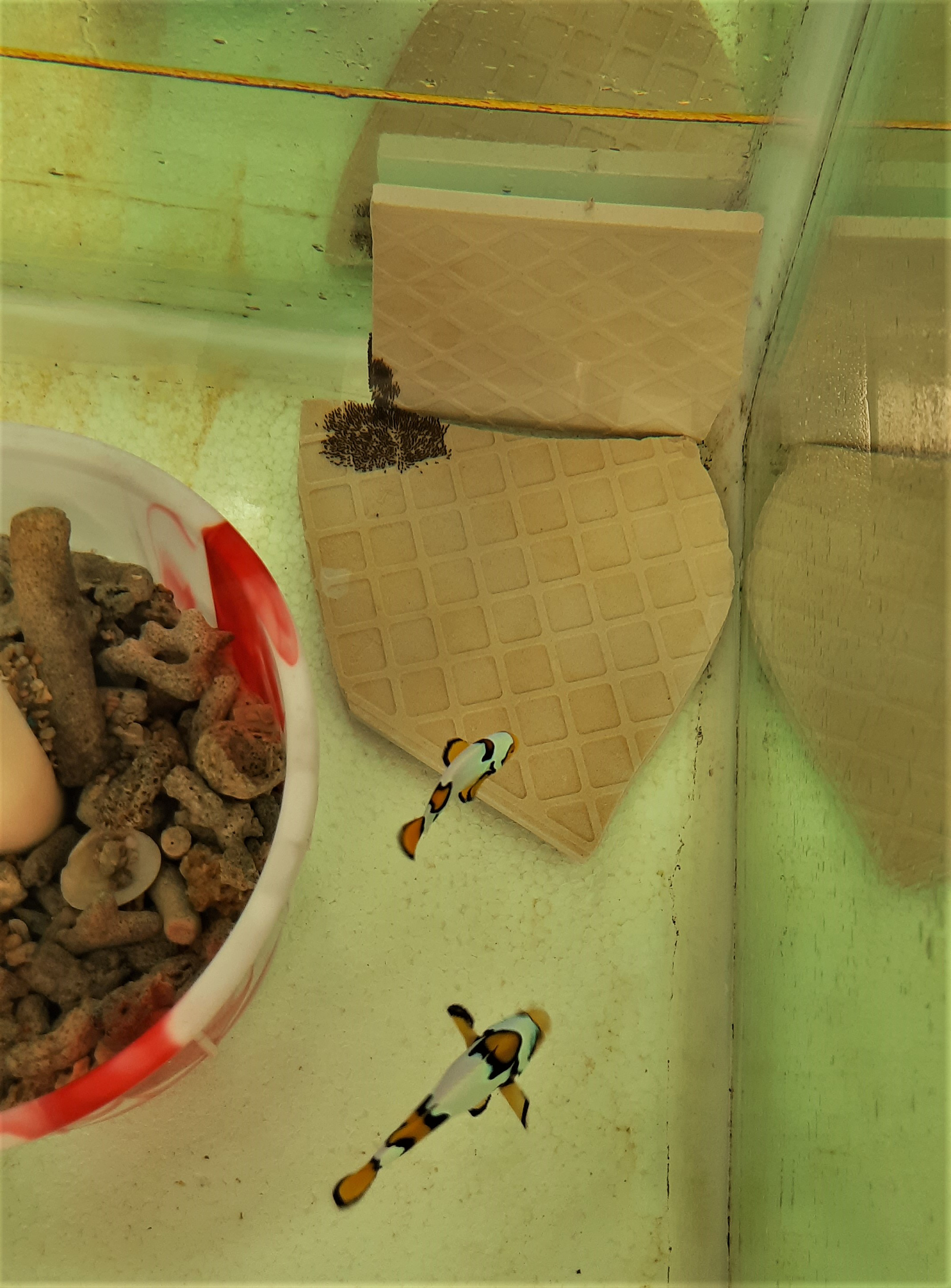 Designer clownfish brooders with eggs deposited on ceramic tiles (brown patch).
