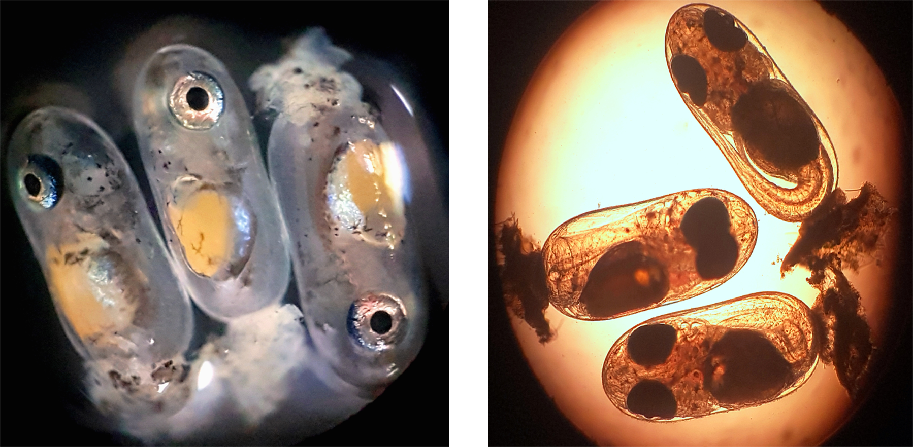 Eggs of designer clown fish (eighth day) showing embryo inside.