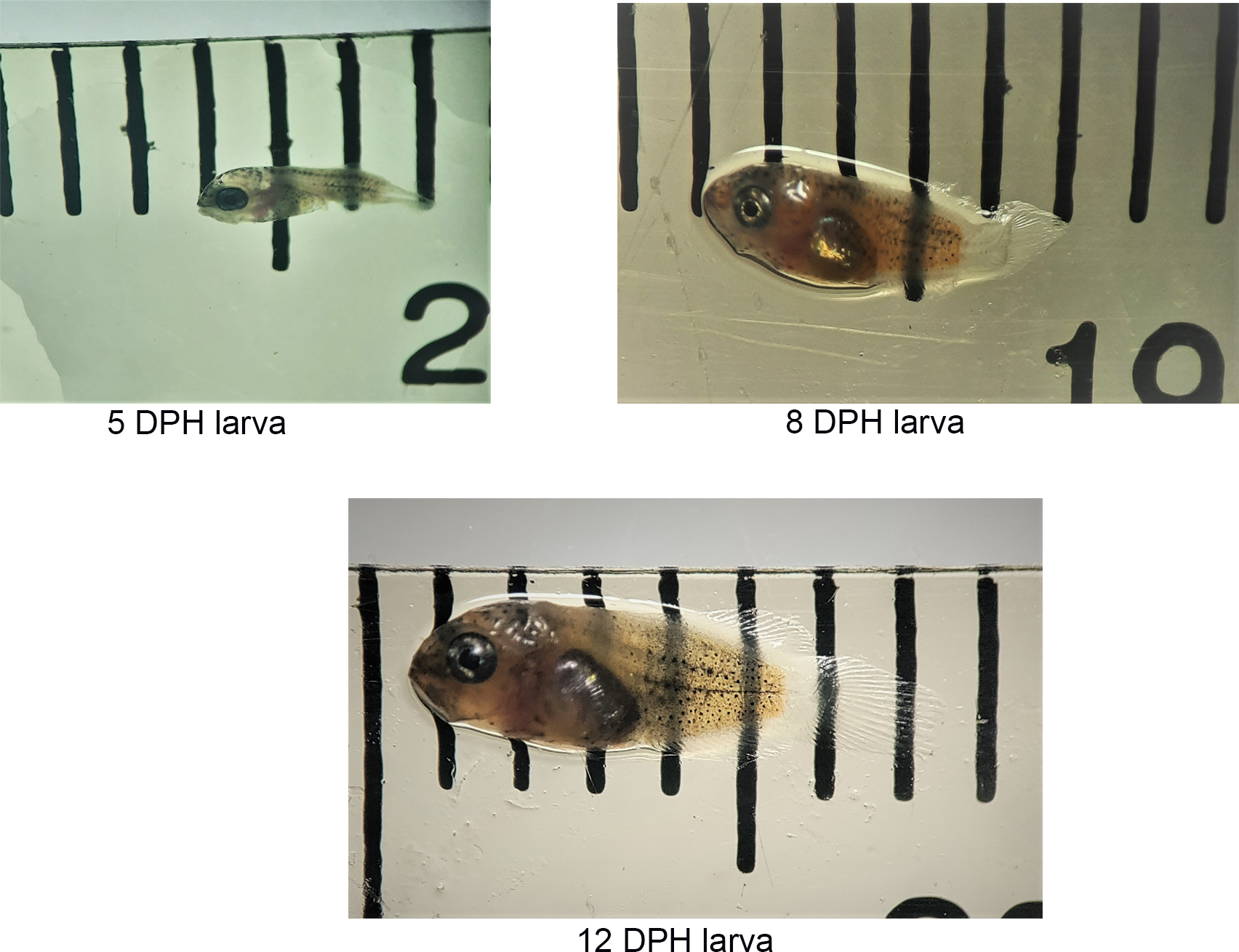 The larvae hatched out in the evening hours after sunset and were fed on rotifers (Brachionus rotundiformis and Brachionus plicatilis) and copepod nauplii (Parvocalanus crassirostris) during the initial days followed by Artemia nauplii from 12 days post-hatch (DPH) onwards by following the green water technique wherein microalgae (Nannochloropsis occulata) were maintained at a cell density of 1 × 105 cells/ml. Weaning to a formulated feed of 0.5-mm size (Varna™, ICAR-CMFRI) started from 18 DPH onwards. The pellet size of the formulated feed was gradually increased from 0.5 to 0.75 mm and then to 1 mm, in line with the growth of the juveniles. The juveniles were further grown to a size of approximately 2- to 3-cm length so that the color patterns of each variety become expressed phenotypically. The photograph of larvae at different stages of growth is shown in Figures 8, 9. The detailed protocol for larval rearing is given in Table 1.