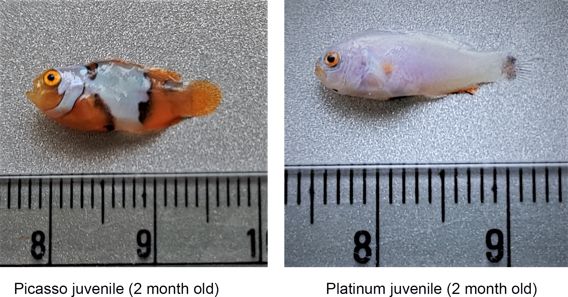 The designer clown fishes exhibited a reproductive behavior similar to that of other members of the subfamily Amphiprioninae. Female was bigger in size than male, and monogamous pairs started laying eggs in a similar fashion to those of other clown fishes. The eggs were cylindrical in shape, and the incubation period ranged from 7 to 8 days. The average number of eggs per clutch varied from 300 to 1,200. Larvae were fed on live feeds such as rotifers and Artemia nauplii initially and later on weaned to formulated pellet feed. The survival rate from newly hatched larvae to juveniles ranged from 40% to 50%. A remarkable observation during the captive breeding was that a uniform phenotypic characteristic or color pattern was not present among the progeny produced from a pair of designer clown fish. The progeny is comprised of a mixture of various types of designer clown fishes in contrast to the case of other clown fishes such as percula or maroon clowns. For example, the progeny produced from a pair of percula clown fish would be all percula only, and that from a pair of tomato clown fish would be all tomato clown fish, whereas in the case of designer clown fish, the progeny from a pair of Picasso consisted of different types such as Picasso, Platinum, and snowflake. Furthermore, the distinguishing characteristics or color patterns in the designer clown fish become clearly visible after a period of about 2 months from hatching. The observations about the phenotype variations in the progeny produced from designer clown fish breeding have been recorded by us over a period of two years.