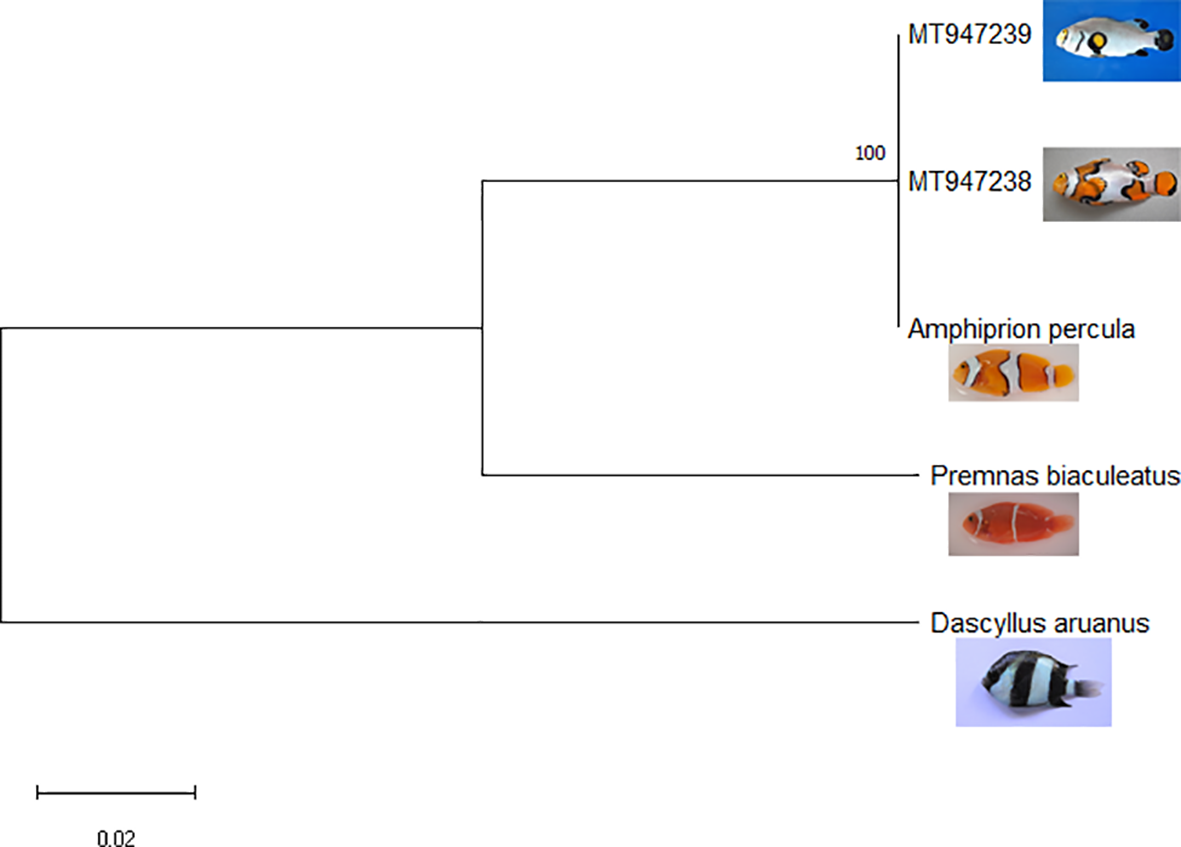 The taxonomic ambiguity was elucidated through both molecular methods and conventional taxonomic tools. The partial COI sequence of Picasso clown fish was submitted to the NCBI GenBank with the accession number MT947238. BLAST results indicated that the partial COI sequence of Picasso clown fish had 100% query coverage and 99.85% identity with sequences of A. percula already deposited in the NCBI GenBank. The partial COI sequence of Platinum clown fish was submitted to the NCBI GenBank with the accession number MT947239. BLAST results showed that the partial COI sequence of Platinum clown fish had 100% query coverage and 100% identity with sequences of A. percula already deposited in the NCBI GenBank. A phylogenetic tree was constructed using the maximum likelihood method in MEGA X (Figure 11). Similar tree topologies were obtained when the phylogenetic analysis was conducted using maximum parsimony, unweighted pair group method with arithmetic mean (UPGMA), and neighbor-joining methods. The tree was rooted in the COI sequence of Dascyllus aruanus.
