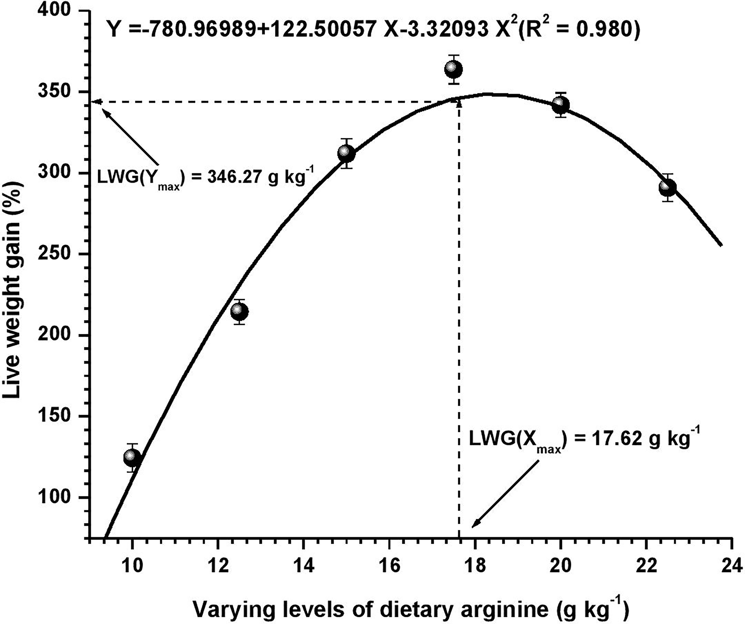 Quadratic regression analysis between dietary arginine levels and live weight gain (LWG %) of Oncorhynchus mykiss (g kg-1).