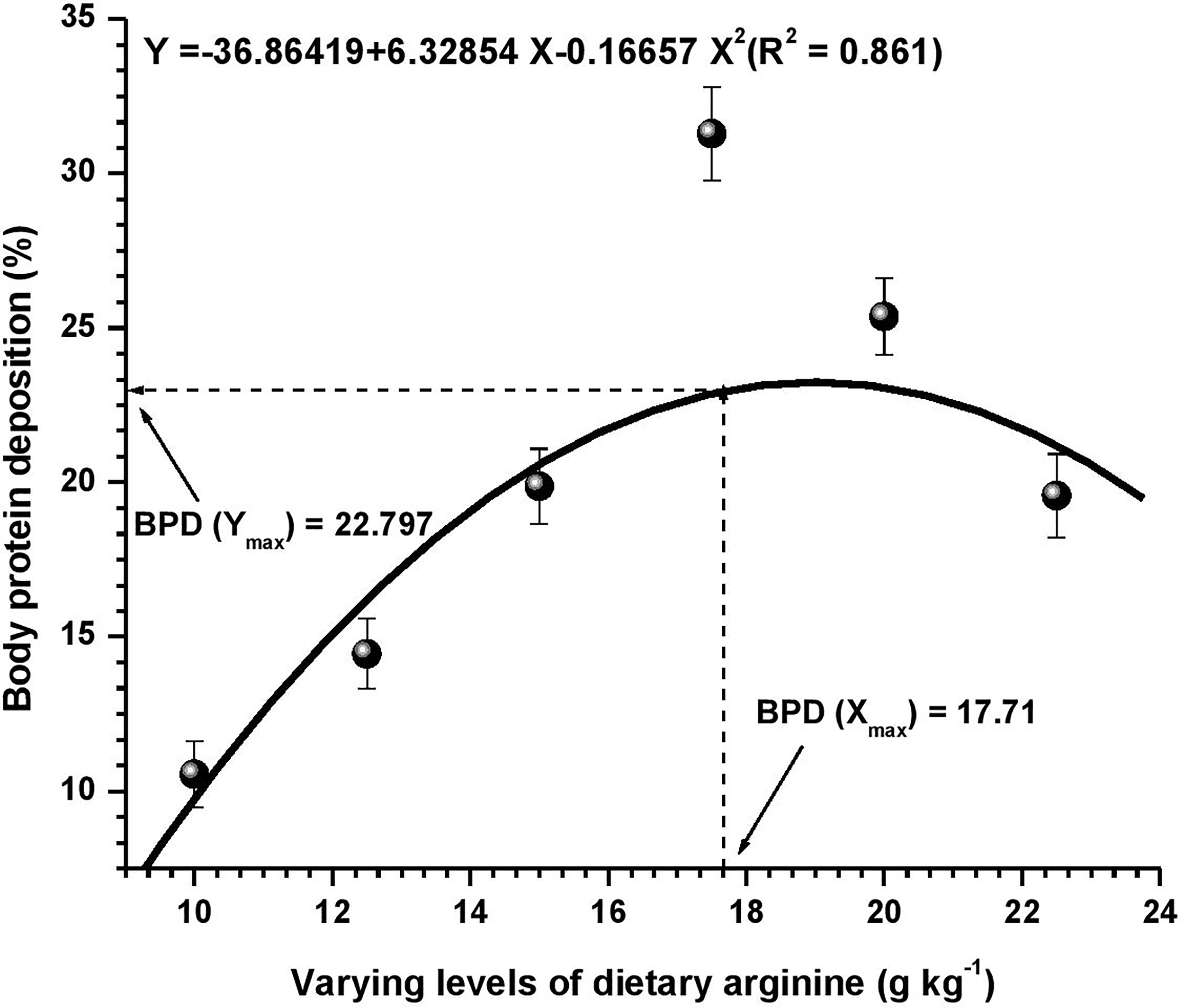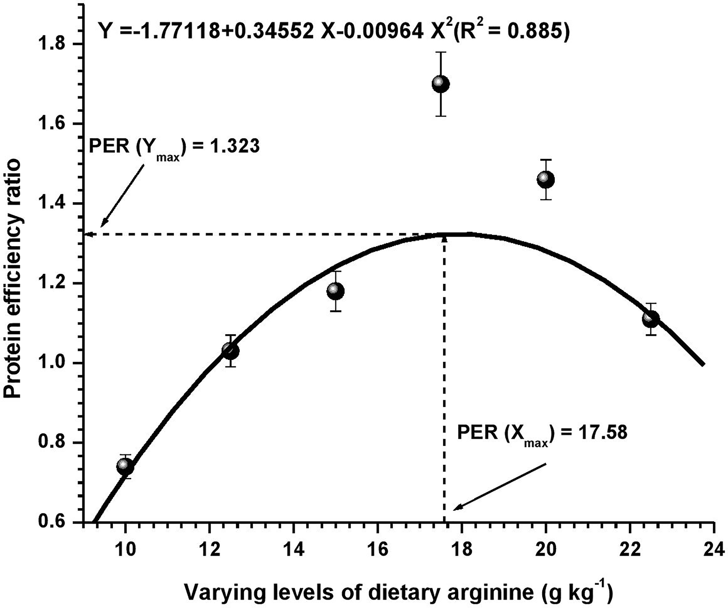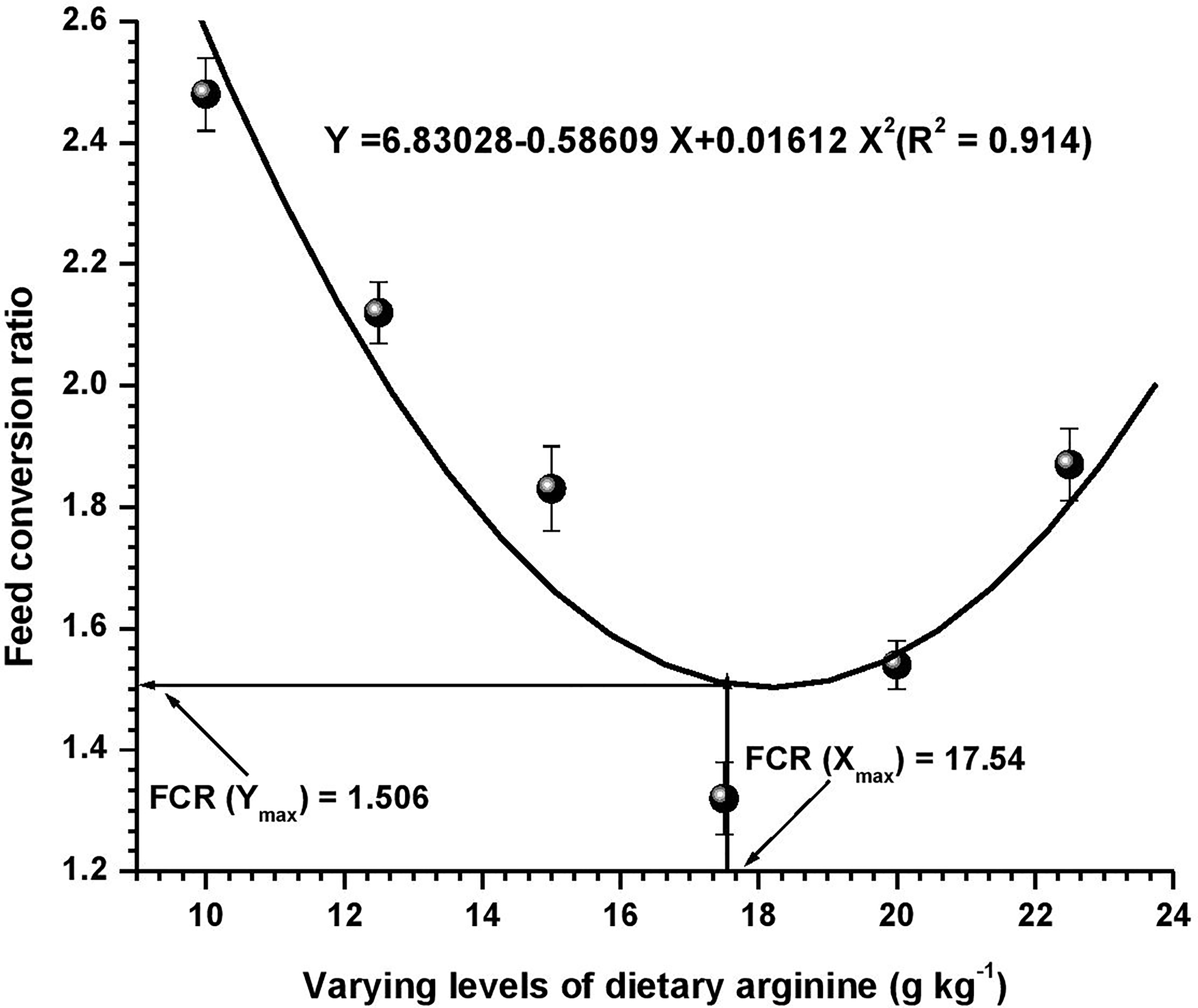 The data were analyzed by one-way analysis of variance (ANOVA) (Snedcor and Cochran, 1967; Sokal and Rohlf, 1981) followed by Duncan’s Multiple Range Test (Duncan, 1955). Polynomial contrast method (Yossa and Verdegem, 2015) was applied to predict the significant (p < 0.05) variations among the treatments. For determining the optimal arginine requirement, second-degree polynomial regression (Y=a+bx+cx2) analysis was applied (Zeitoun et al., 1976). Origin software (version 8.5.1; San Clemente, CA) was used for all the statistical analyses.