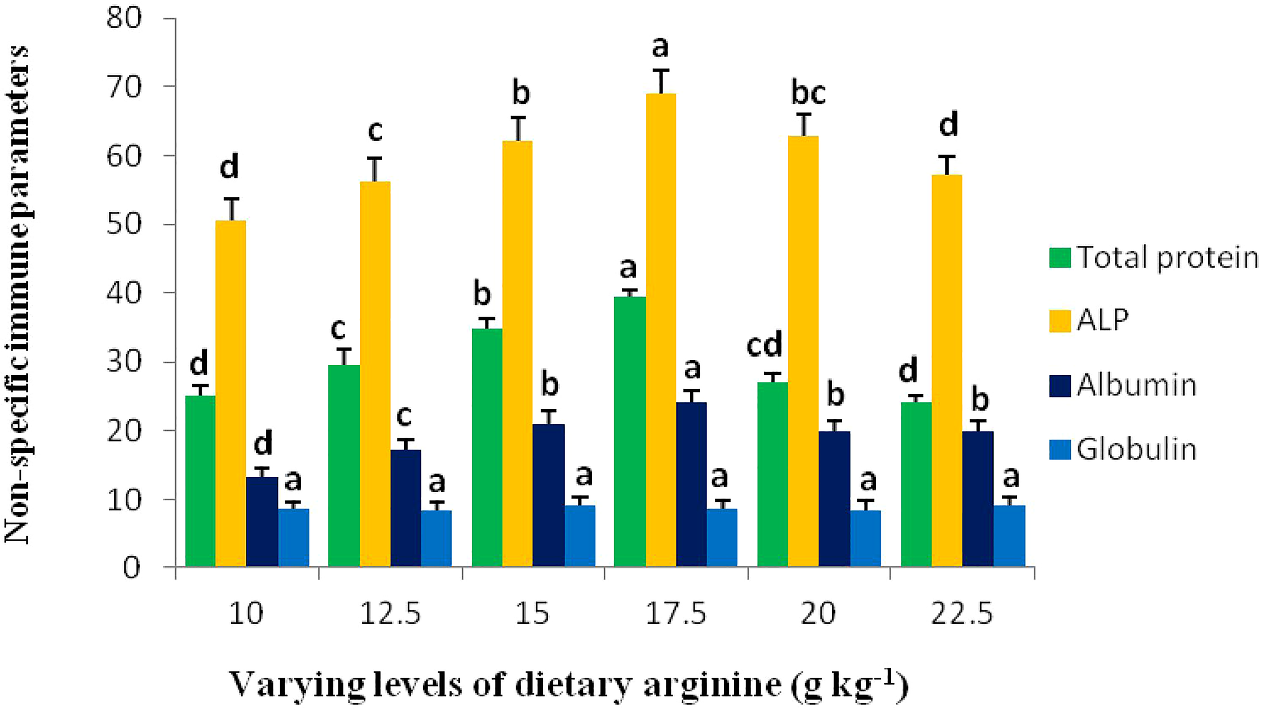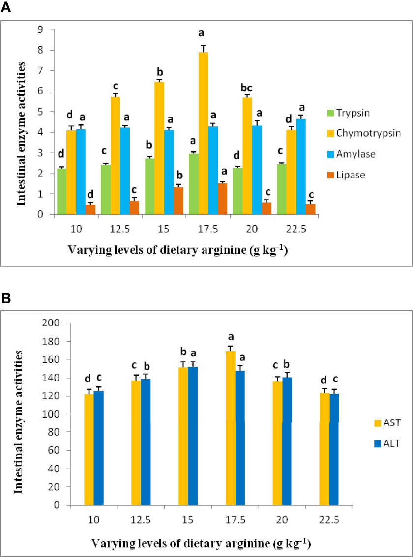 Among both macro and micro nutrients required by fish, amino acids are considered an essential micronutrient that is actually obtained from a good quality protein diet (Ahmed, 2013). These are building blocks for tissue proteins and acts as effective antioxidants as well as hormone secretion regulators (Jobgen et al., 2006; Larson et al., 2007; Wang et al., 2007; Hu et al., 2008). Arginine, as one of the essential amino acid in fish, is treated as one of the most versatile amino acids and has different physiological roles such as nitrogen metabolism, inflammation, immune responses, and is considered the significant substrate for the production of nitric oxide (Jobgen et al., 2006; Costas et al., 2011; Zhou et al., 2015; Hoseini et al., 2020). It is also involved in protein metabolism (Liang et al., 2016) and the synthesis of creatine, ornithine, glutamate, polyamines, and agmatine (Wu and Morris, 1998; Liang et al., 2016). Moreover, arginine provides the amino group for creatine synthesis and plays a significant part in high-energy phosphate for ATP recovery in the fish muscle (Zhou et al., 2012). Furthermore, supplementation of arginine has been accounted to stimulate macrophages for cytokine secretion (Barbul, 1995). It has additionally been proven that arginine might expand total leucocyte counts due to its main function as a substrate for polyamine biosynthesis purpose, which are fundamental for cell expansion and differentiation, and further associated with haematopoiesis (Narita et al., 1995; Shah et al., 2002). The role of arginine has obviously been exhibited in different growth-related mechanisms together with insulinotropic impact (Plisetskaya et al., 1991). Past studies revealed that 10.0–32.0 g kg-1 of dietary arginine is suitable for the proper growth of fish [NRC (National Research Council), 2011]. The role of arginine for the improvement of growth and other immune related processes has clearly been demonstrated in several fish species (Cheng et al., 2011; Chen et al., 2012; Zehra and Khan, 2013; Jiang et al., 2015; Liang et al., 2016).