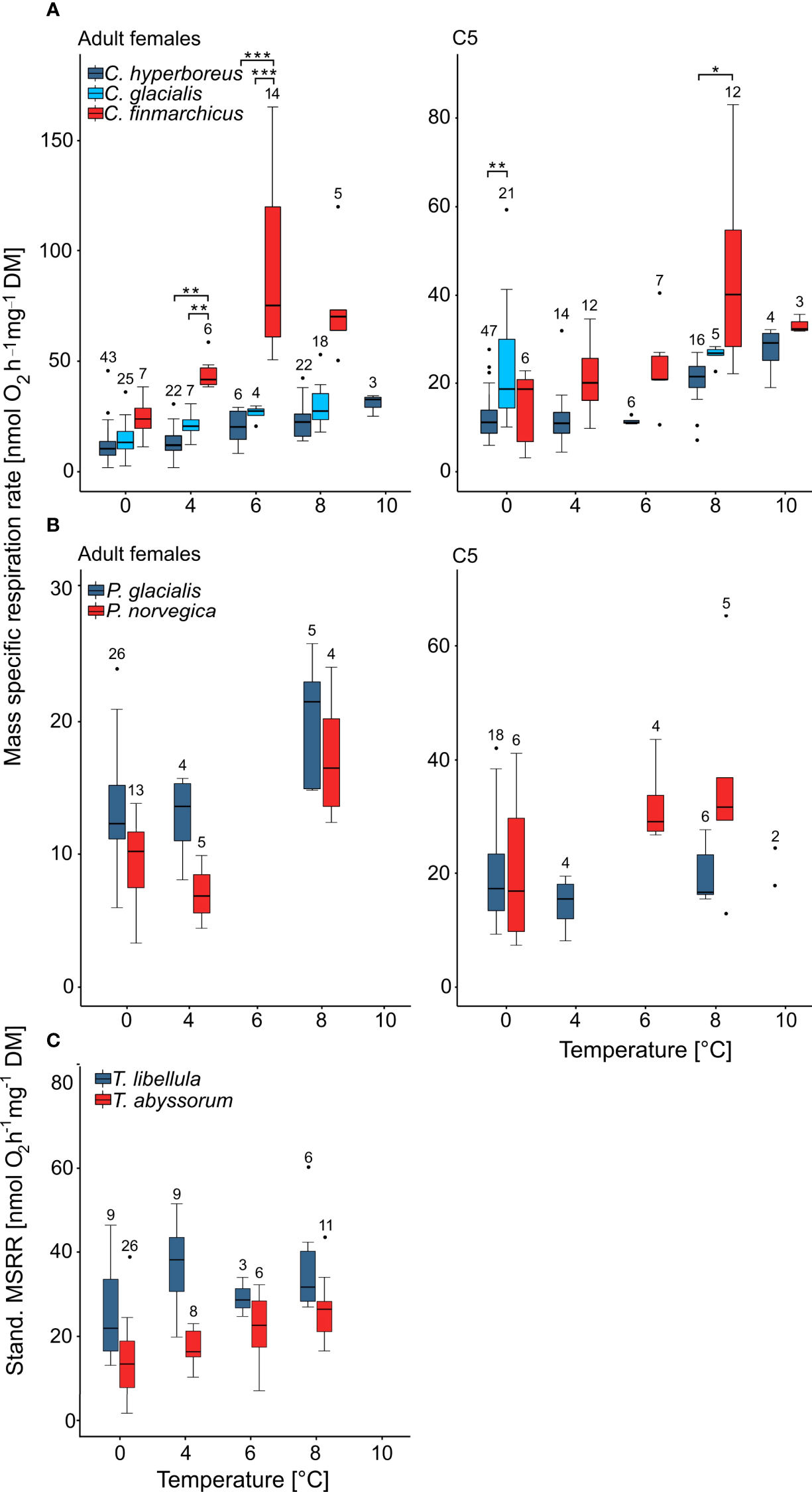 Mass-specific (A, B) and standardized mass-specific (C) respiration rates (Stand. MSRR) of polar-Arctic (blue) versus boreal-Atlantic (red) zooplankton species from Fram Strait. Stand. MSRR were used for Themisto species, as they had highly variable dry masses. Box represents the interquartile range (lower edge: 25th percentile, the upper edge: 75th percentile, central line: median, whiskers extend to minimum and maximum values within 1.5 times the interquartile range). Dots represent potential outliers that are above or below 1.5 times the interquartile range, respectively. Asterisks show significant differences in standardized respiration rates between species at the respective temperature (*p≤ 0.05, **p≤ 0.01, ***p≤ 0.001). Values above the boxplots show number of measurements. (A)Calanus spp., (B)Paraeuchaeta spp., (C)Themisto spp.