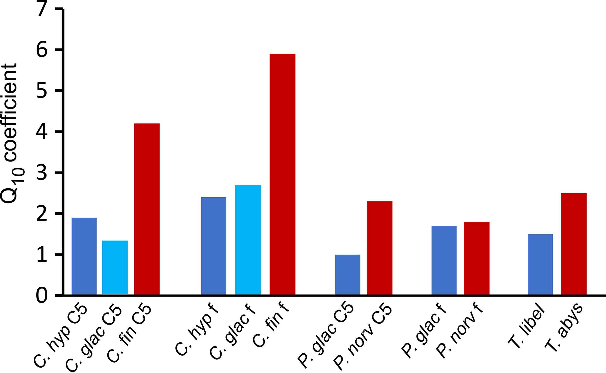 Q10 values were generally higher for boreal-Atlantic congeners than for polar-Arctic species (Figure 3). These differences in Q10 coefficients were most pronounced in Calanus species. Polar-Arctic C. hyperboreus and C. glacialis had Q10 values between 1.3 and 2.7. In contrast, the boreal-Atlantic C. finmarchicus had much higher Q10 values of 4.2 in C5s and 5.9 in adult females.
