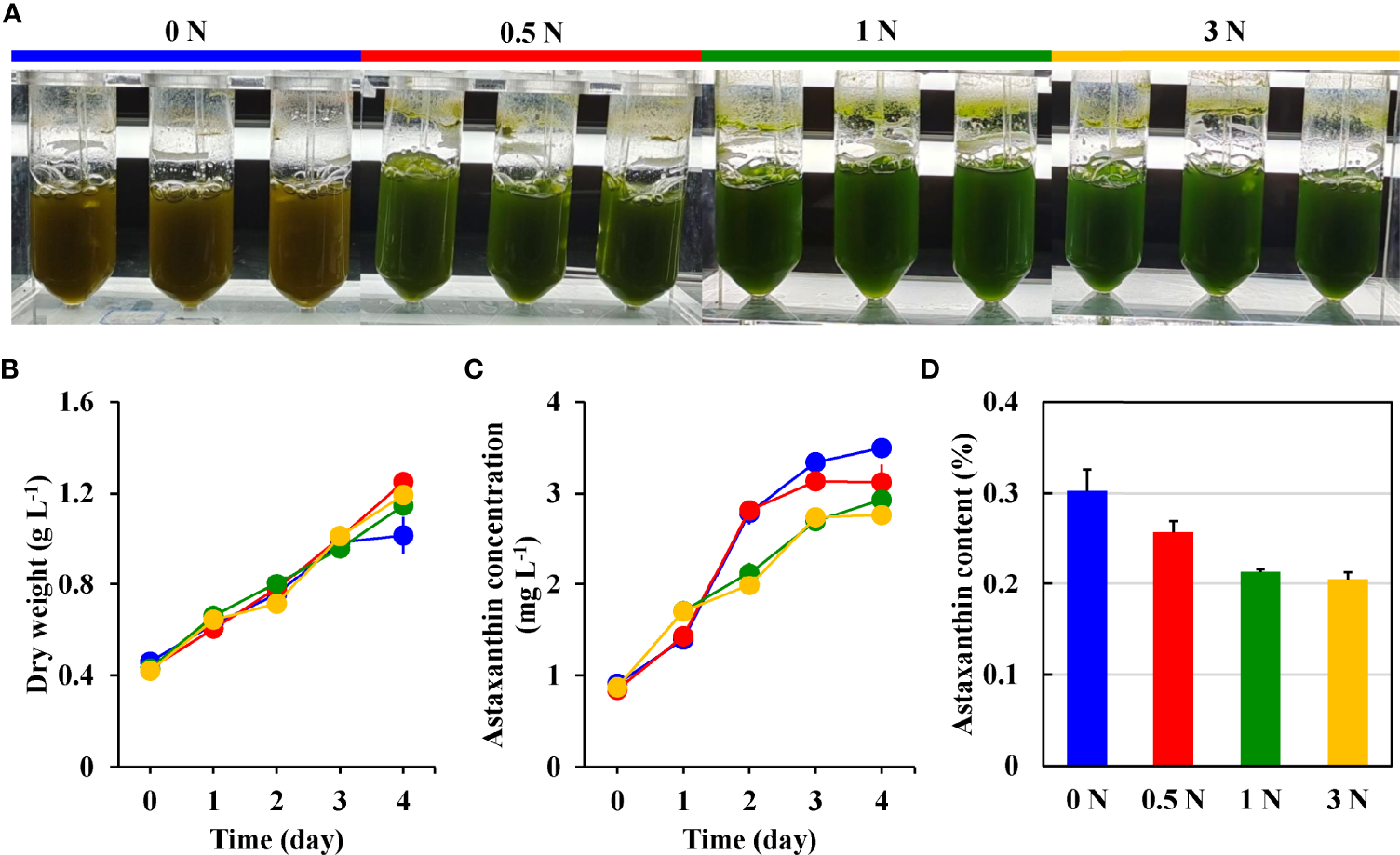 The color changes (A), dry weight (B), astaxanthin concentration (C), and astaxanthin content (D) of H. pluvialis motile cells in the 0 N (blue), 0.5 N (red), 1 N (green), and 3 N (yellow) group.