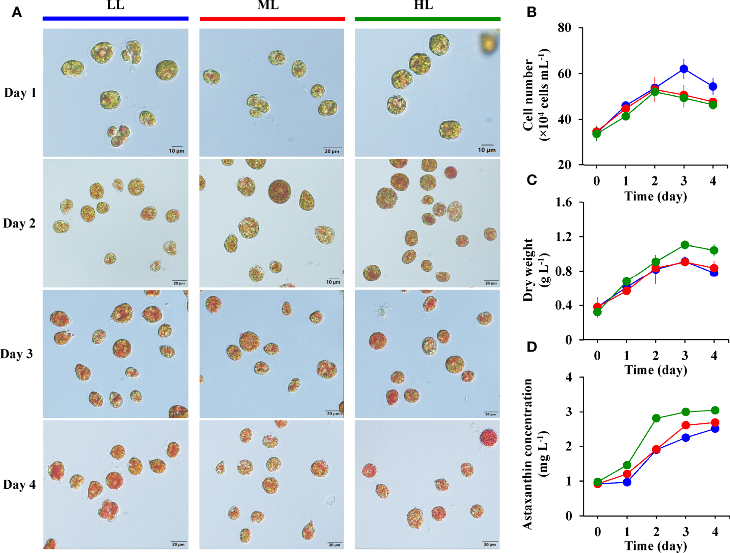 The cell morphological changes (A), cell number (B), dry weight (C), and astaxanthin concentration (D) of H. pluvialis in the LL (blue), ML (red), and HL (green) group.