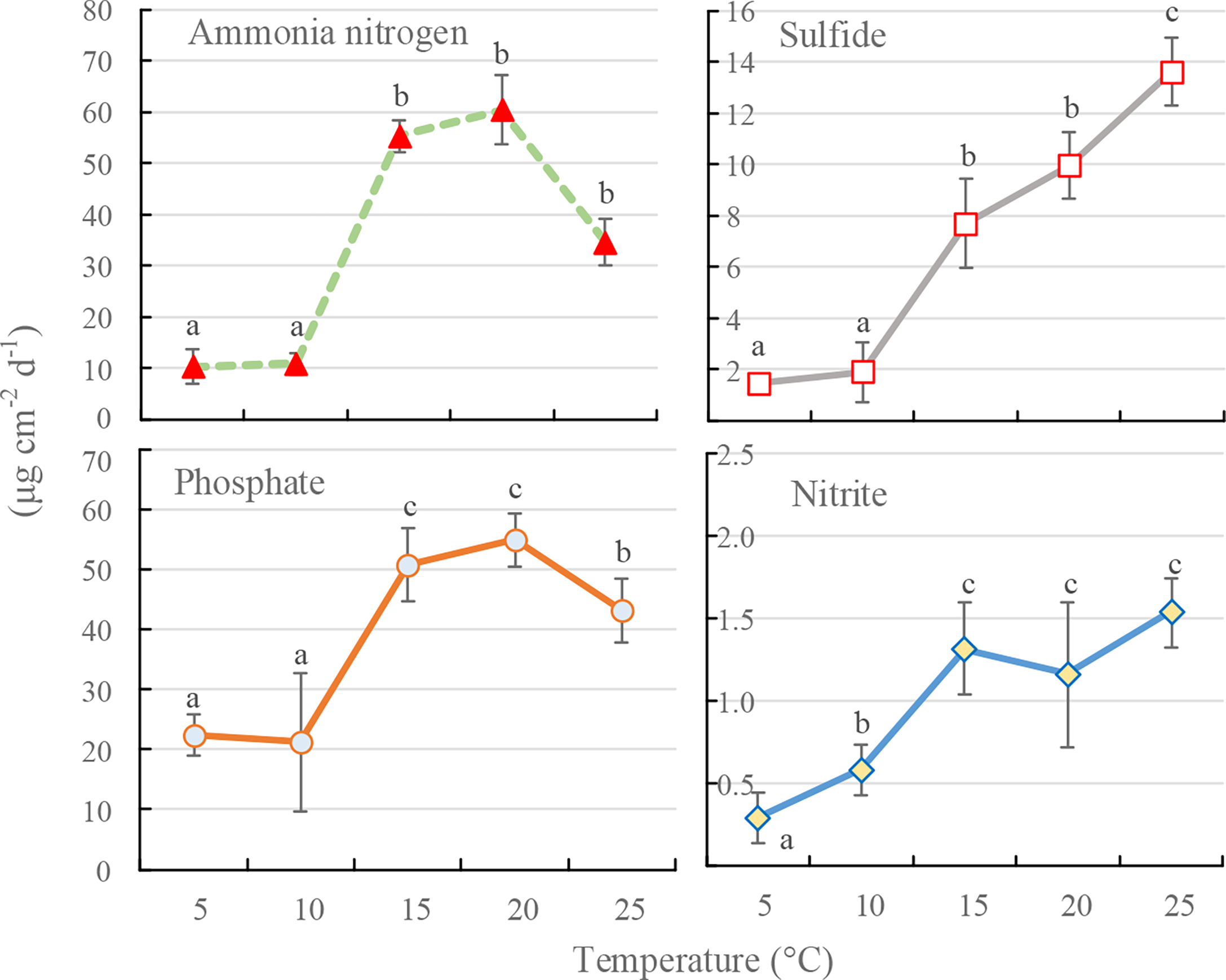 The dissolution efficiencies of phosphate (F=3.532, P=0.032, df=4), ammonia nitrogen (F=3.314, P=0.035, df=4), nitrite (F=6.544, P=0.007, df=4), and sulfide (F=11.466, P=0.001, df=4) from the sediment in the polychaete burrow increased significantly between 5°C and 25°C (P<0.05). In general, dissolution efficiencies increased steadily with temperature, although the dissolution efficiency of phosphate was significantly greater at 20°C than at 25°C (Figure 3). The dissolution efficiencies of phosphate and ammonia nitrogen were noticeably greater than those of nitrite and sulfide (Figure 3).