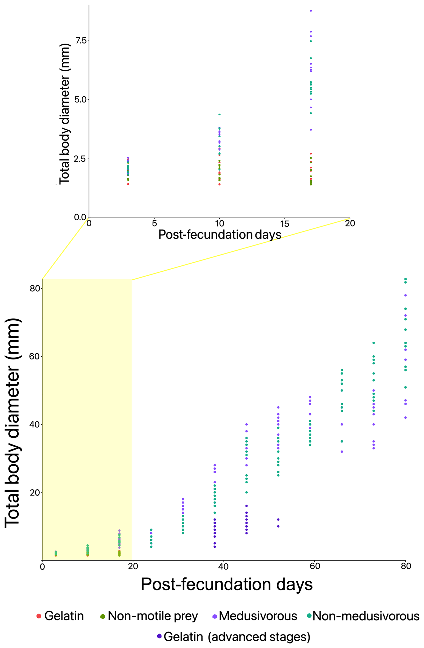 To describe and monitor the growth of the jellyfish on each food regimen, each week, 10 living individuals were randomly collected from each culture. Ephyrae and metaephyrae were relaxed with a menthol solution (4% w/v), transferred into a ventral position on a glass slide and photographed using a camera (Imaging Source) attached to a binocular loupe (ZUZI 220). Afterwards, the individuals were carefully returned to their respective cultures. The morphology and the total body diameter (TBD) were described and measured (from lappet to lappet) as in Ballesteros et al. (2021b) by photo-analysis with the Fiji version of ImageJ software (Schindelin et al., 2012). For advanced stages, jellyfish were transferred to a plastic tray with a small amount of seawater. TBD was measured directly with a digital caliper with the animals in a ventral position. As in the early stages, individuals were carefully returned to each culture. A total of 602 individuals were measured and analyzed during the research.