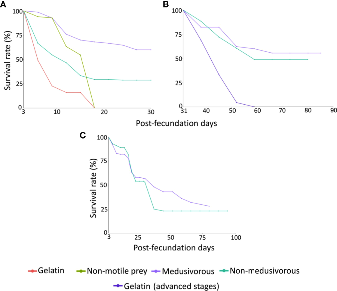 | Culture 3 (medusivorous) | Early stages; Aurelia sp. and rotifer. Advanced stages; Aurelia sp., Artemia sp. nauplii, codfish eggs, gelatin and white shrimp |