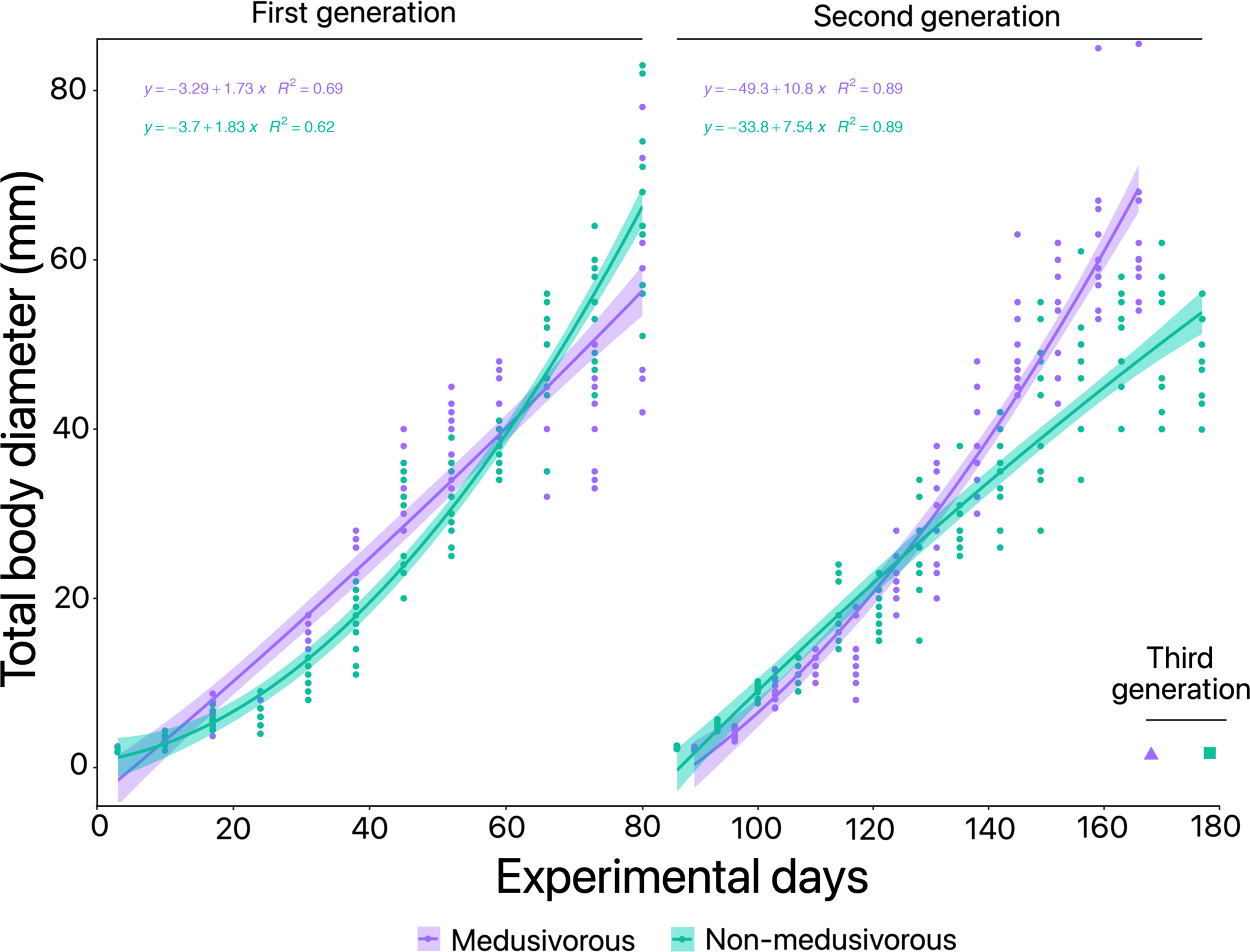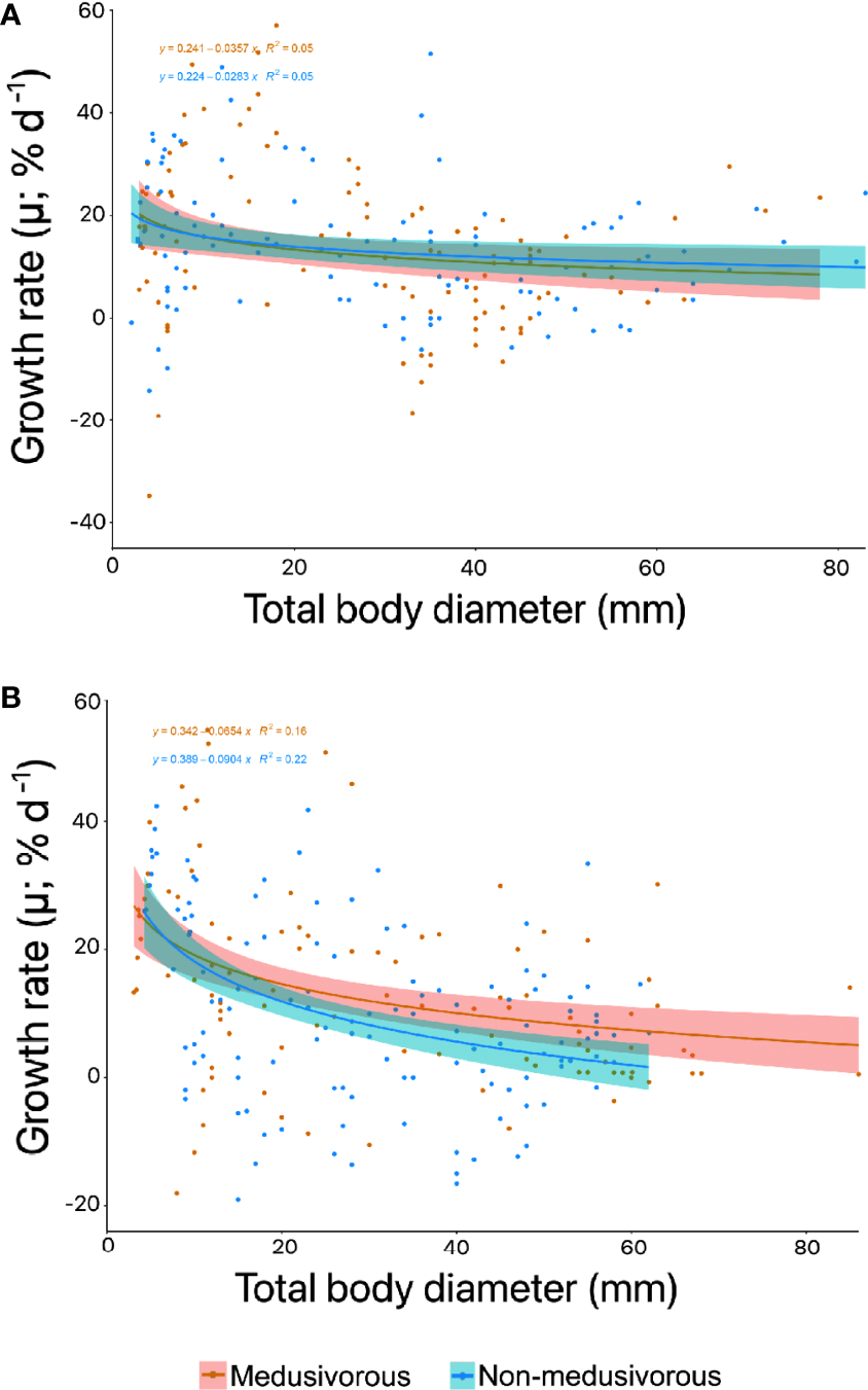 Instantaneous growth rate (% d-1) for the successful food regimens for Pelagia noctiluca in (A) first generation and (B) second generation. The decrease in growth rate with total body diameter (TBD) (solid line) represents a power relationship according to positive instantaneous growth rates. The shaded area indicates 95% confidence limits. Food regimens: Culture 3, medusivorous diet (presence of Aurelia sp.) and Culture 4, non-medusivorous diet (absence of Aurelia sp.).