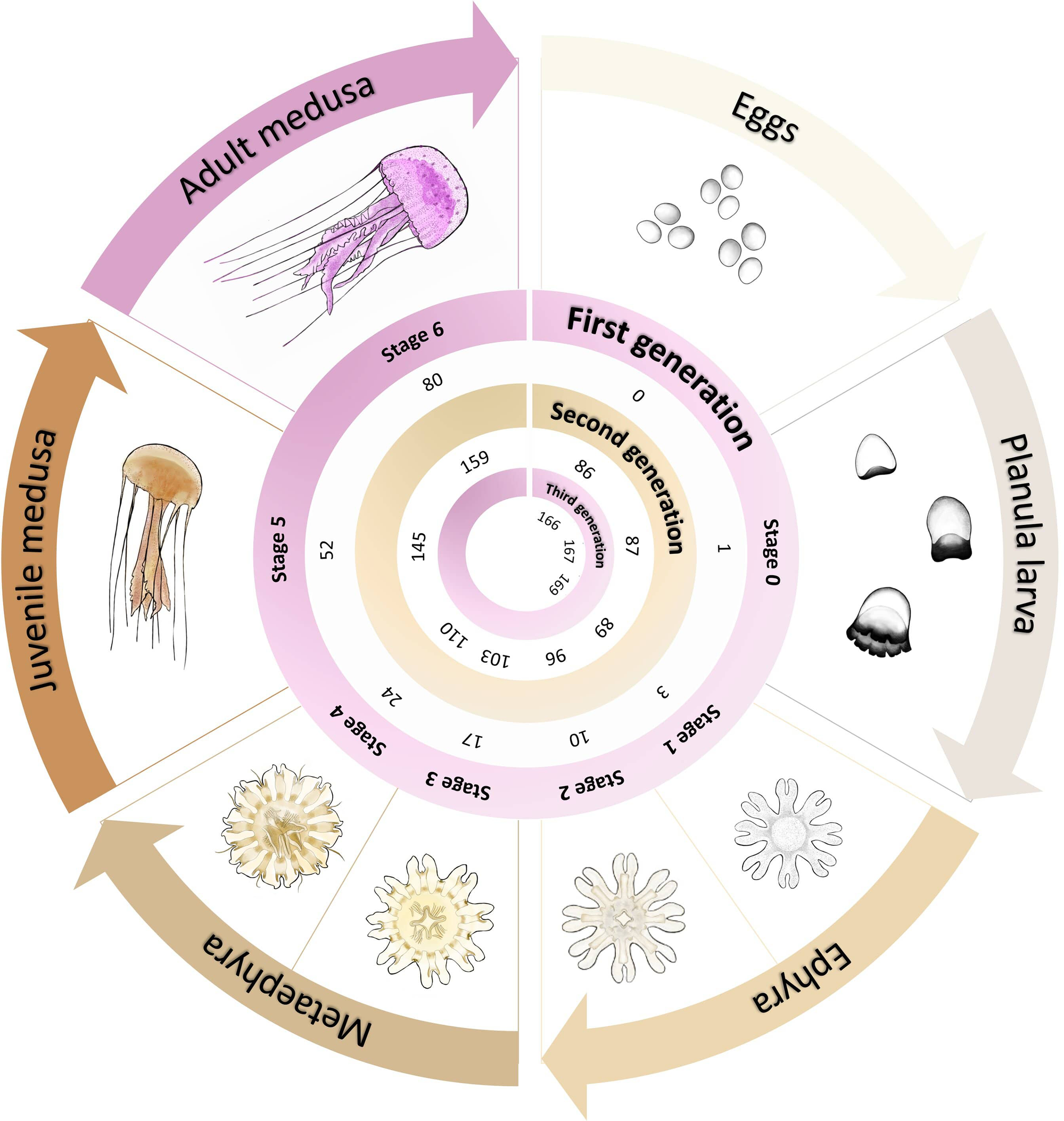 Graphical representation of the Pelagia noctiluca life cycle optimization at 22°C. It includes the post-fecundation days until each stage of its life cycle is reached, when fed with the medusivorous diet (culture 3). Detailed morphological and cnidome descriptions for each life cycle stage can be consulted in Ballesteros et al. (2021b). Illustrations of the life cycle by Lau López.