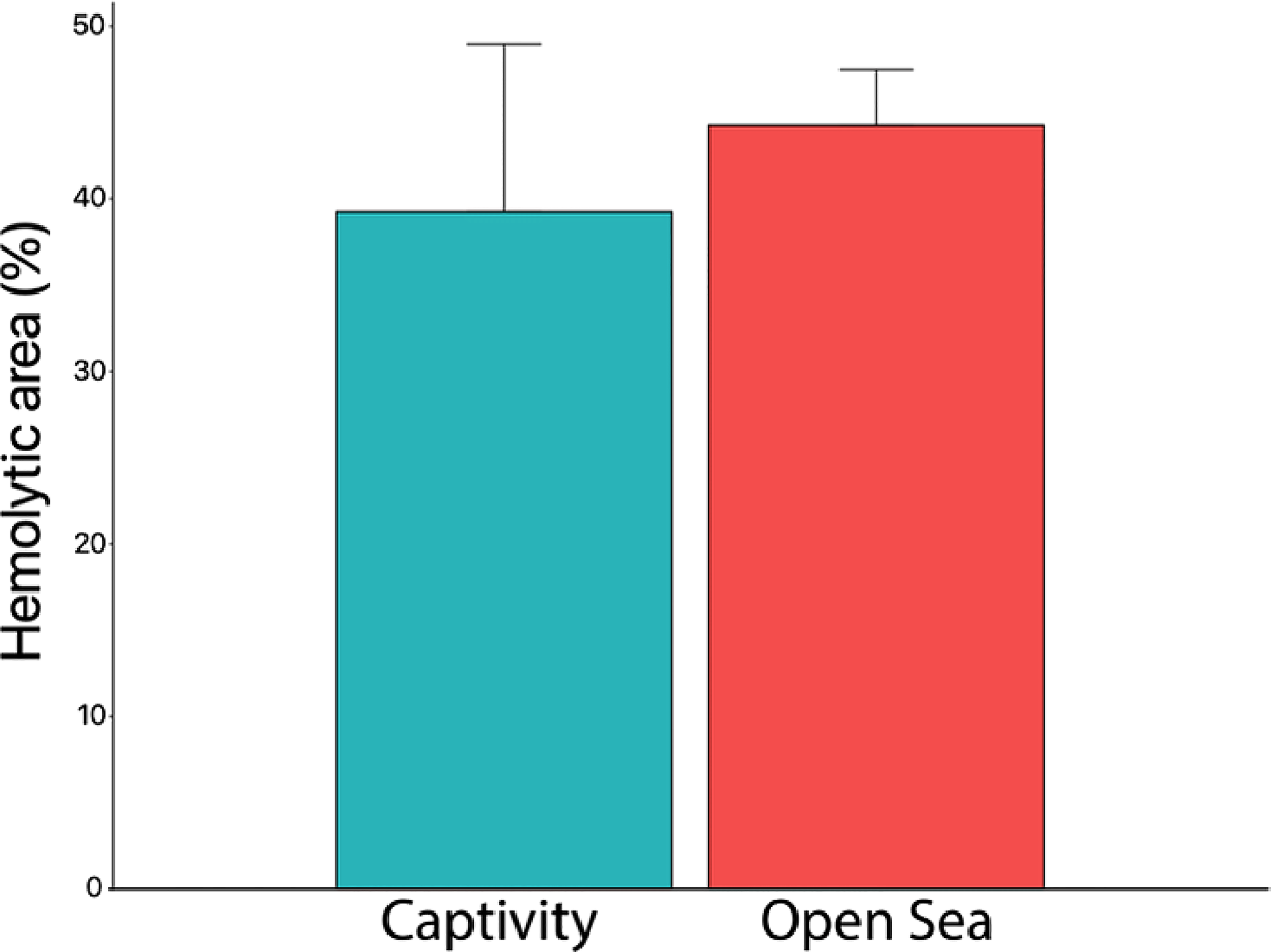 Hemolytic area (%) produced by the venom from captive and open-sea jellyfish. No significant differences were observed between jellyfish from the open sea and those from captivity (p value 0.2) (Mann–Whitney test). Captivity replicates, n = 10; open sea replicates, n = 8.