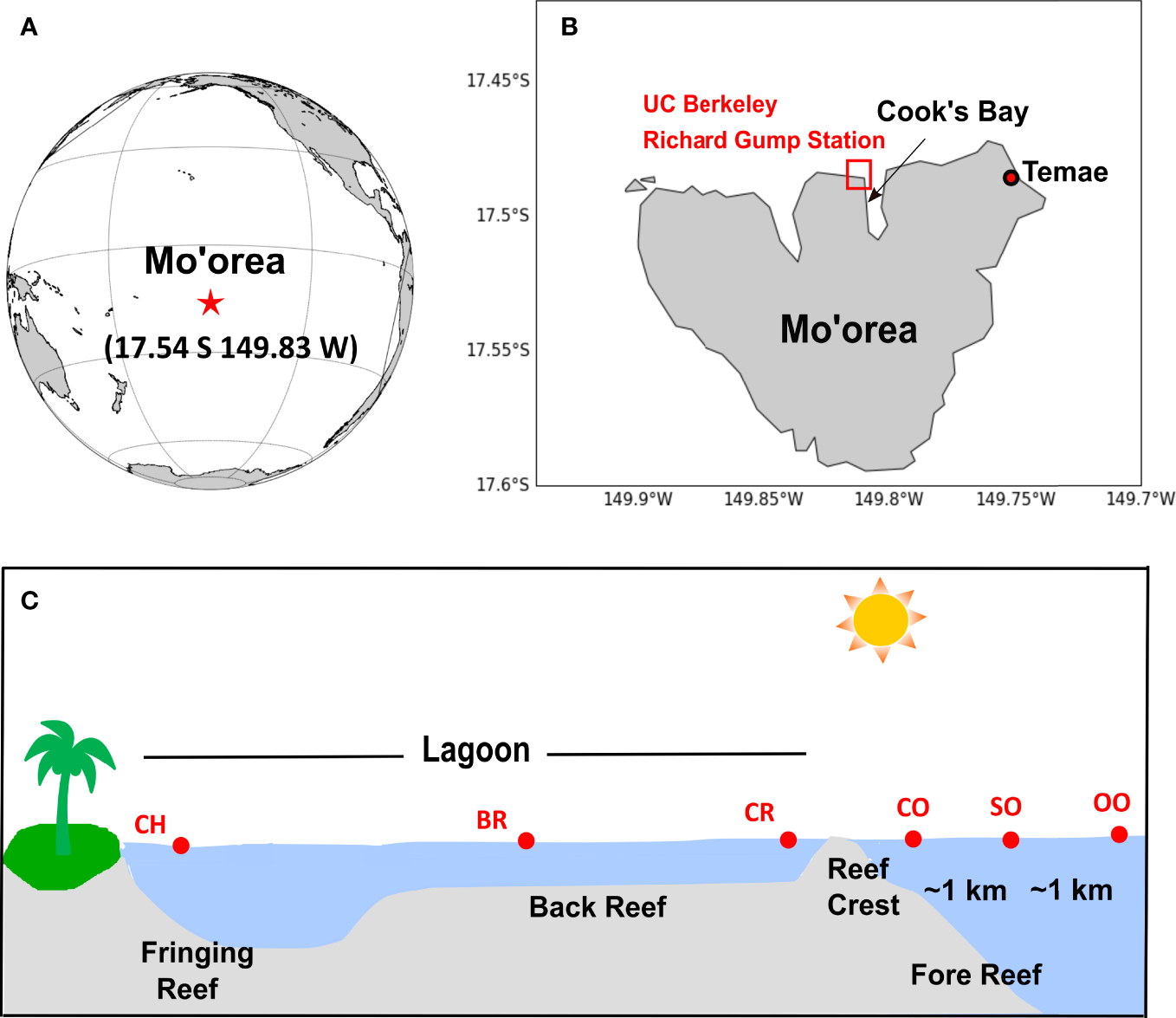 Locations of (A) the island of Mo’orea, in the South Pacific Ocean, (B) the Temae Park coral reef, and the UC Berkeley’s Richard Gump Research Station and coral reef where most of the work reported here was conducted, and (C) schematic showing the Mo’orea coral reef and reef-ocean transect sampling stations: nearshore outflow channel (CH), back reef (BR), reef crest (reef side of the reef crest, CR), ocean crest (ocean side of the reef crest, CO, ~300 m away from station CR), shelf ocean (SO, ~1 km away from CO), and open ocean (OO, ~2 km away from CO). Note that distances between stations are not drawn to scale. Panel (C) was adapted with permission from Leichter et al. (2013).