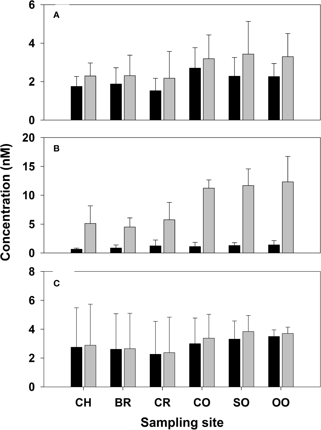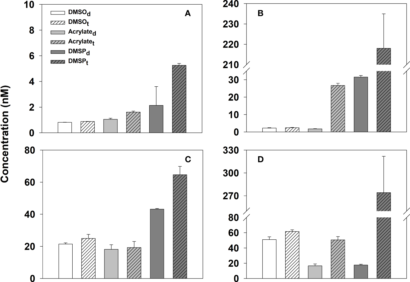 Mean dissolved (black-filled bars) and total (grey-filled bars) concentrations of (A) acrylate, (B) DMSP, and (C) DMSO in samples collected from repeated sampling at each sampling station between April 6 and 24, 2018. Error bars denote the standard deviation from the measurement of multiple samples collected over different days at each site (n = 4–5).
