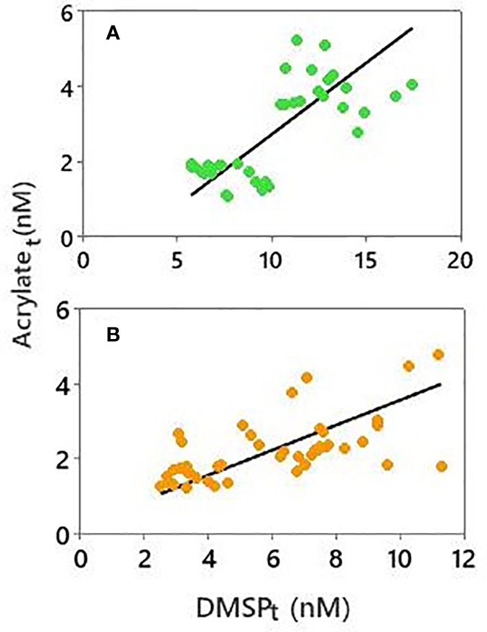 Correlation between acrylatet and DMSPt in samples collected between 4 and 27 April from the (A) oceanic stations (SO and OO) and (B) coral reef (CH, BR, CR). Solid lines denote the best-fit from orthogonal regression analysis: (A) slope = 0.38 ± 0.06, y-intercept = -1.08 ± 0.60 nM, r = 0.75; (B) slope = 0.33 ± 0.06, y-intercept = 0.24 ± 0.41 nM, r = 0.63.