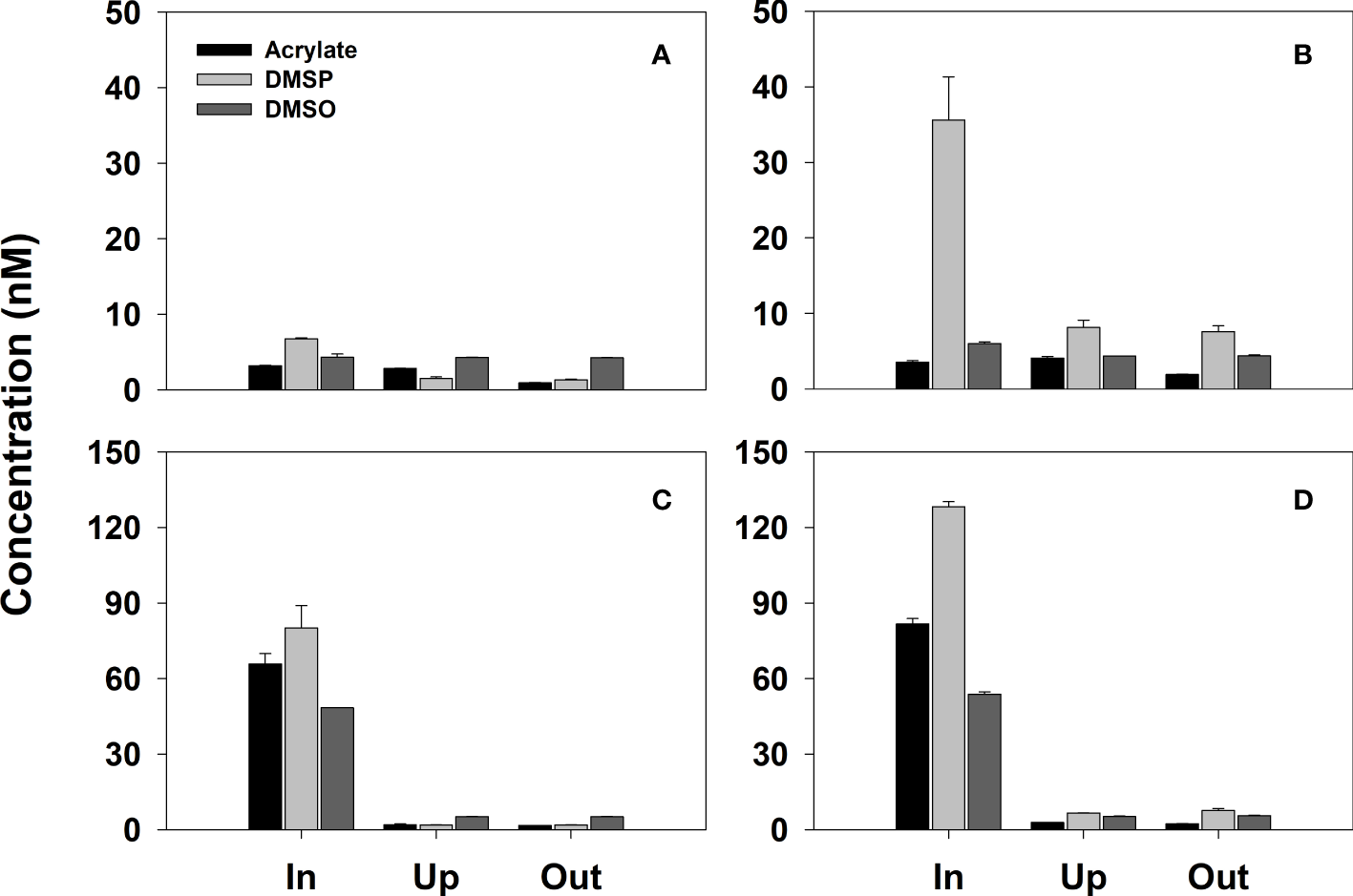 Dissolved (panels A, C) and total (panels B, D) acrylate, DMSP and DMSO in seawater samples collected at different distances from the coral Pocillopora sp. (panels A, B) and A pulchra (panels C, D) in a coral reef located offshore of Temae Park, Mo’orea at 7:00 am local time, April 23, 2018. x-axis label notation: In, a ~ 0.5 cm away from the tip of several coral polyps, Up, ~ 10 cm away from coral patch, and Out, several meters away from the coral overlying sandy sediment. See Table S2 for the data used to generate this figure.