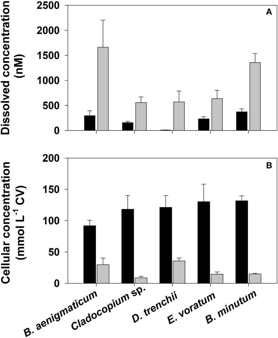 (A) Dissolved and (B) cell volume (CV) normalized cellular concentrations of acrylate (grey-filled bars) and DMSP (black-filled bars) in non-axenic batch cultures of five dinoflagellate coral symbionts during their exponential growth phase. Error bars represent the standard deviation determined from the analysis of three separate cultures. See Table S3 for culture collection and strain designations.