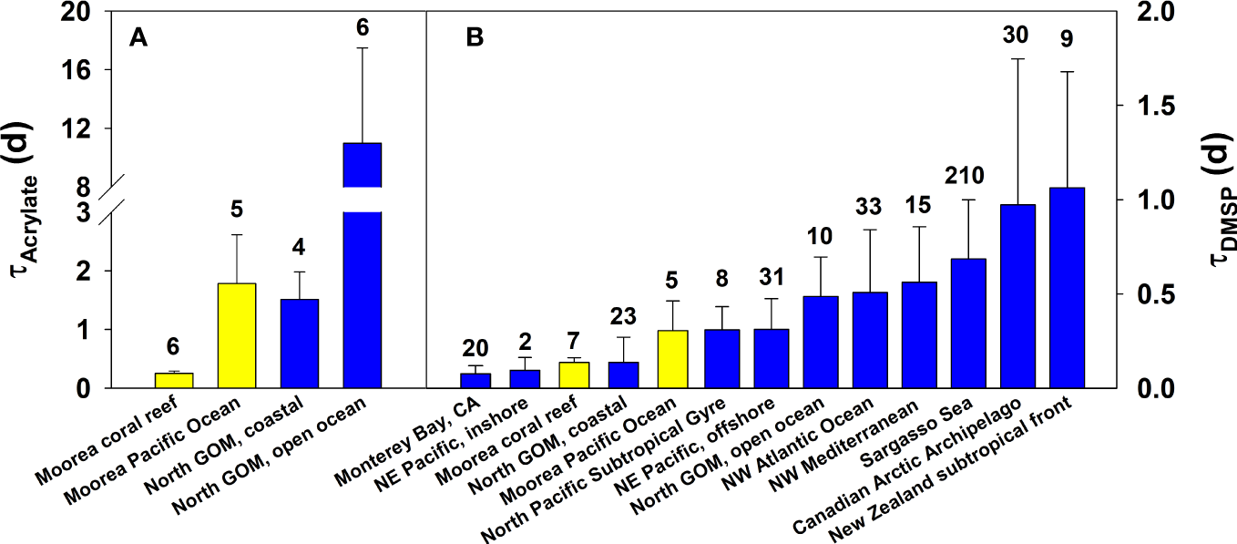 Acrylate and DMS are produced in equimolar quantities from the enzymatic lysis of DMSP by lyases. However, while DMS has been studied extensively in the global oceans including in coral reefs (Jones et al., 2018; Jackson et al., 2020) due to its potential role in regulating the Earth’s radiation budget and climate (Charlson et al., 1987), only a few studies have examined the cycling and ecological impacts of acrylate in coral reefs beyond the impacts to the coral holobiont. In this study, we demonstrate that (1) both acrylate and DMSP are rapidly consumed by planktonic microbes once released into the dissolved phase, and (2) the consumption of dissolved acrylate and DMSP exhibit diel patterns in phase with their release from the coral holobiont.